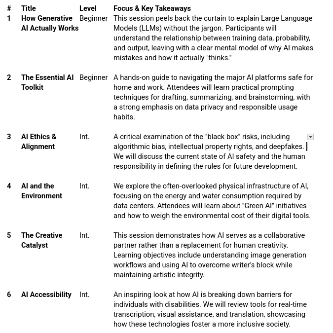 The AI Isn’t Magic series is designed to demystify artificial intelligence for the general public. By stripping away the marketing hype and technical jargon, these workshops empower participants to use generative tools critically and effectively.