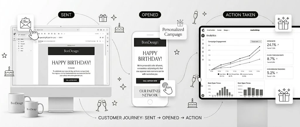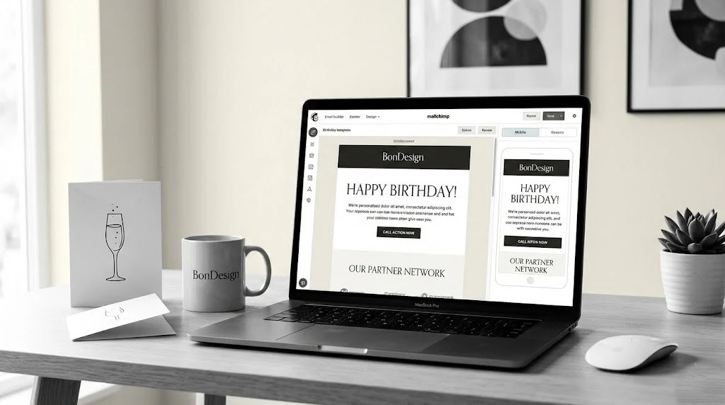 Personalized birthday email campaign in Mailchimp for BonDesign. Elegant design, responsive layout, partner network CTAs. Strong open and click-through rates.
