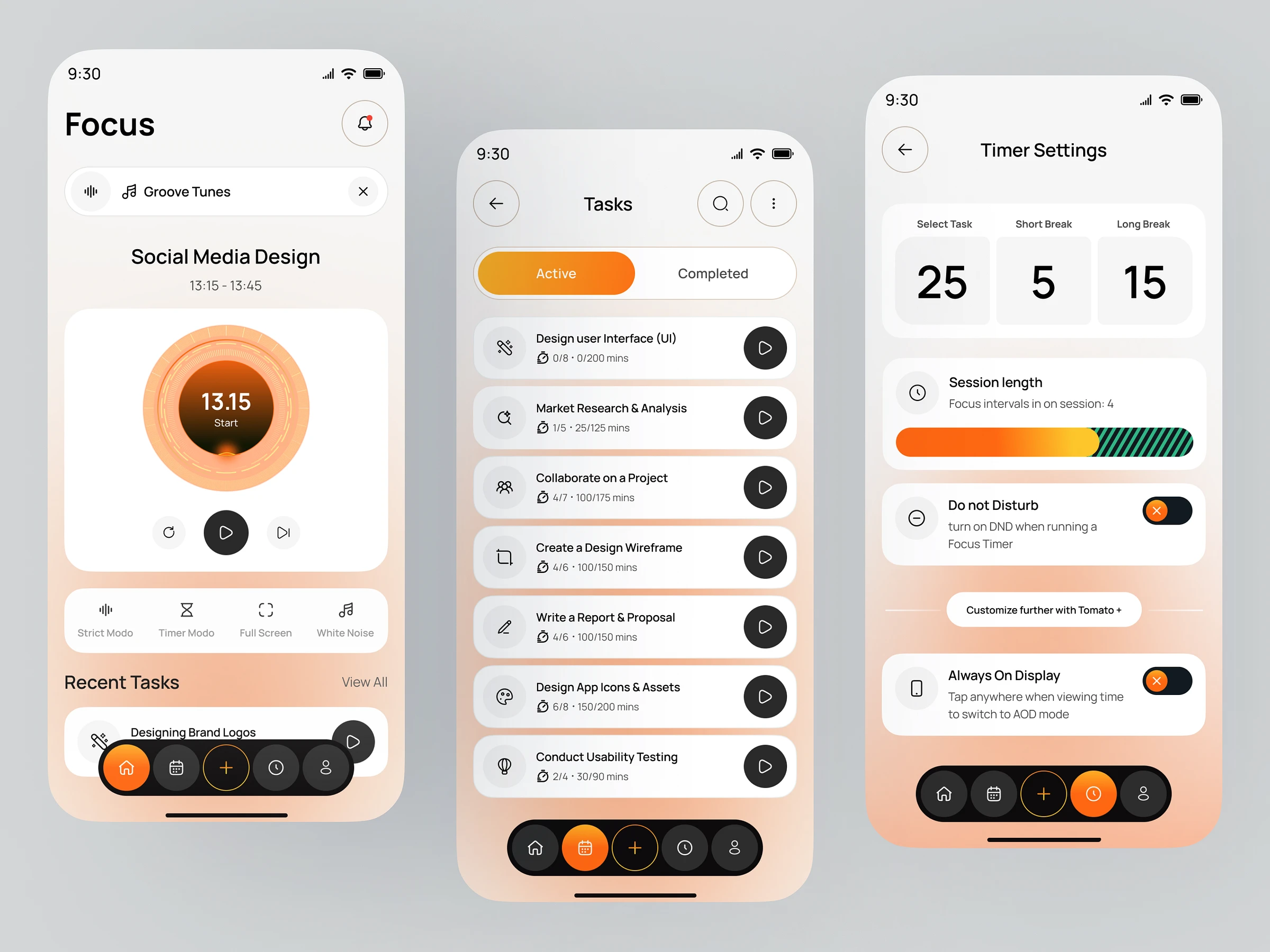 A modern mobile app UI designed to help users stay focused and manage tasks more effectively. The interface combines a Pomodoro-style focus timer with task organization, progress tracking, and distraction-free sessions. Clean layouts, soft gradients, and intuitive controls create a calm and productive experience for daily work and long focus sessions.