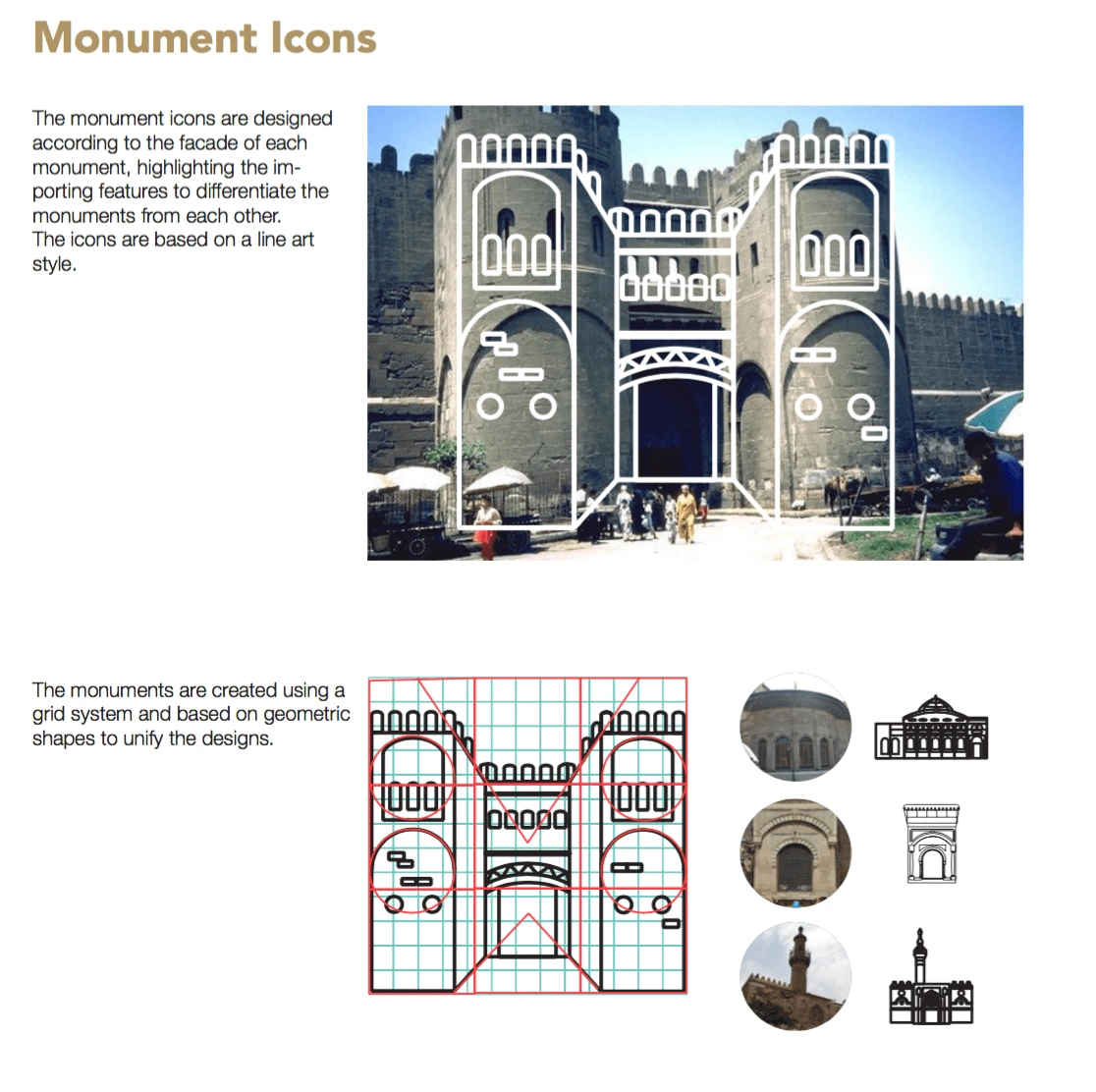 The designs were achieved through extensive research of the maps, architectural motifs and artistic style of each era. The project is composed of: a visual identity for Moez Street, a proposal for a physical signage system for the street and a mobile application that works as a tour guide. The signs later on came to life after 3 years through the organization Art D’Egypte who hosted an open exhibition event in Moez Street. Identification signs were produced with the sponsorship or Art D’Egypte, UNESCO and The Ministry of Antiquities in Egypt.