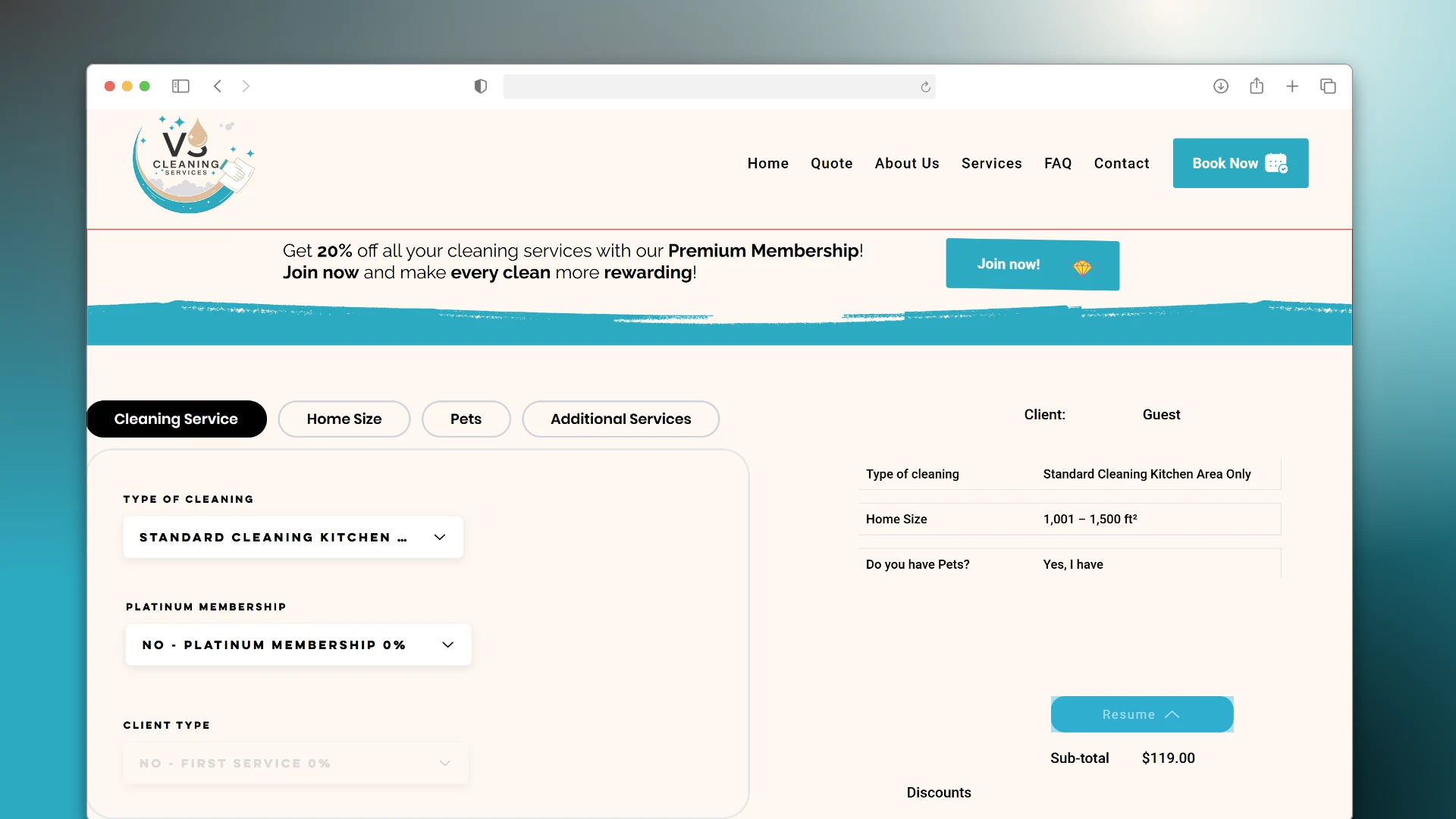 For this project, I designed and developed a custom quote and booking system tailored to the client’s residential cleaning business. The form allows users to select multiple services (e.g., deep cleaning, windows, appliances), calculates the total price in real time, and offers a smooth checkout experience with integrated payment.