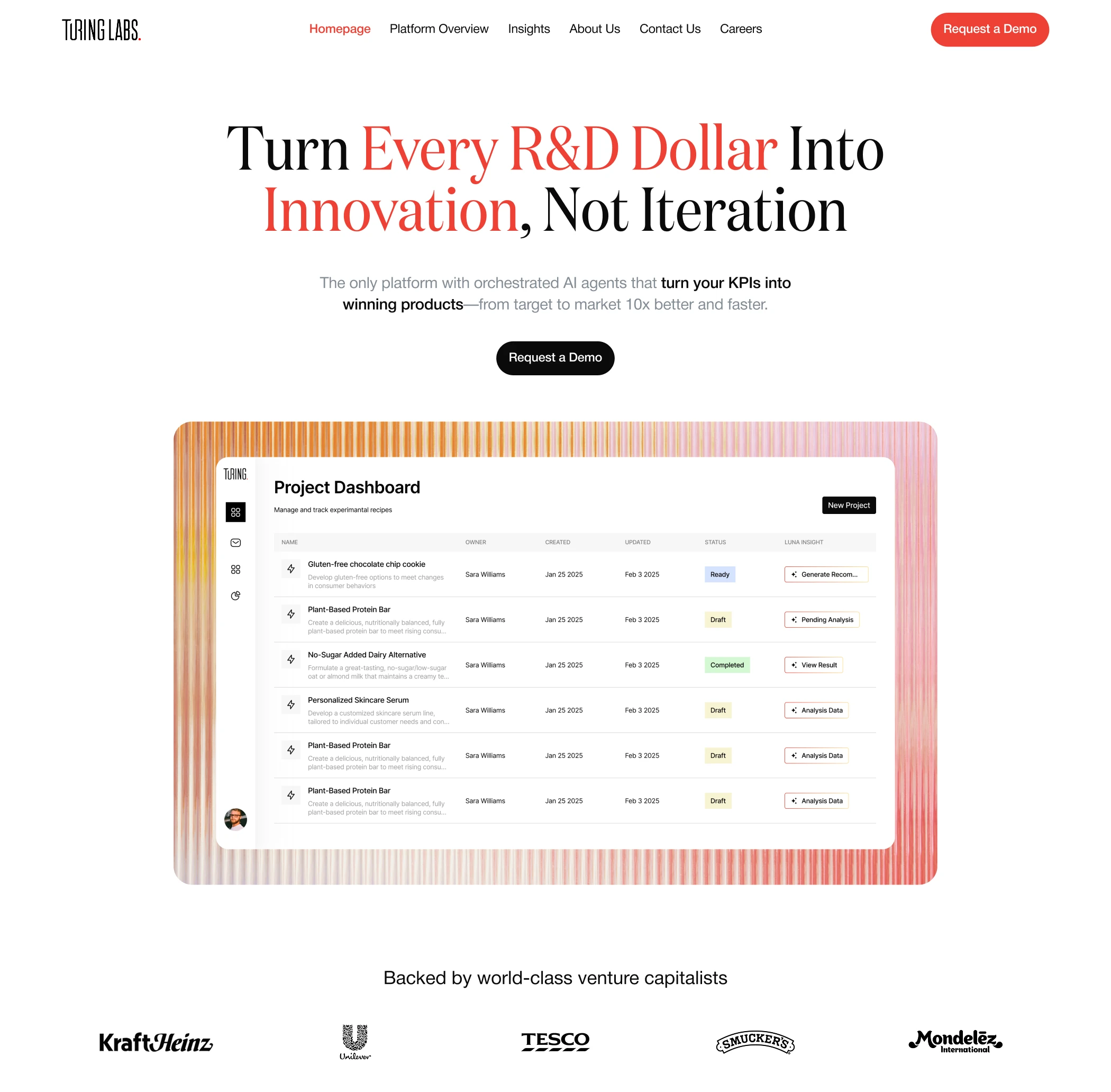 UI/UX overhaul for Turing Labs' AI SaaS. We simplified complex R&D features into a clean interface, helping F&B brands optimize formulas faster and easier.