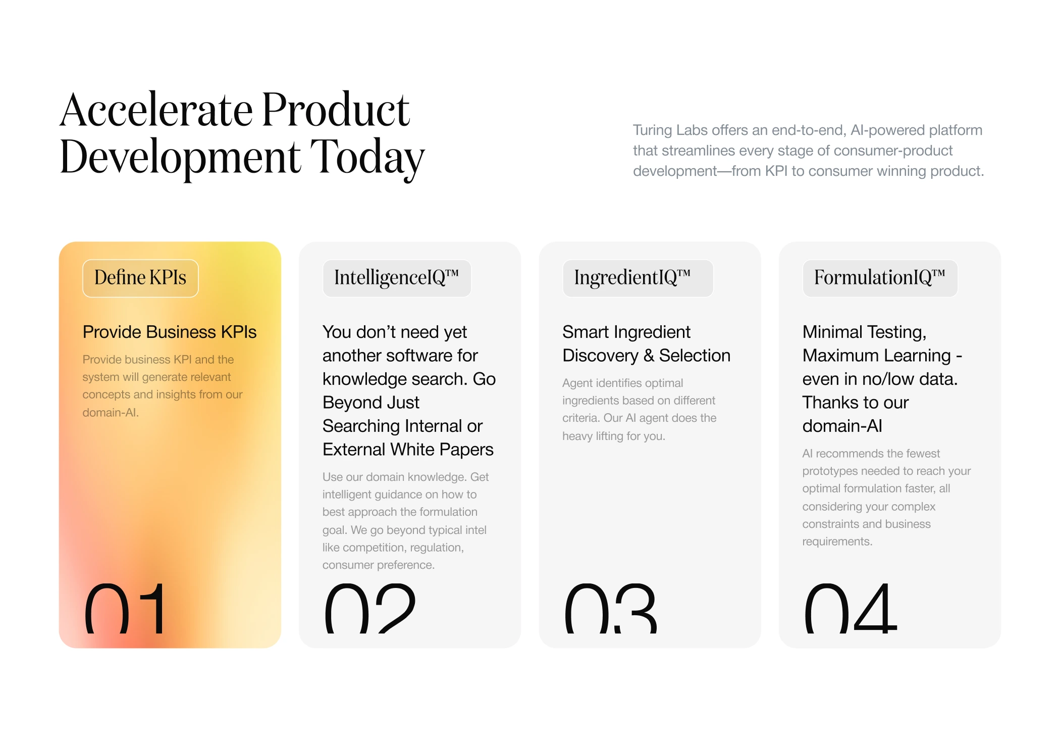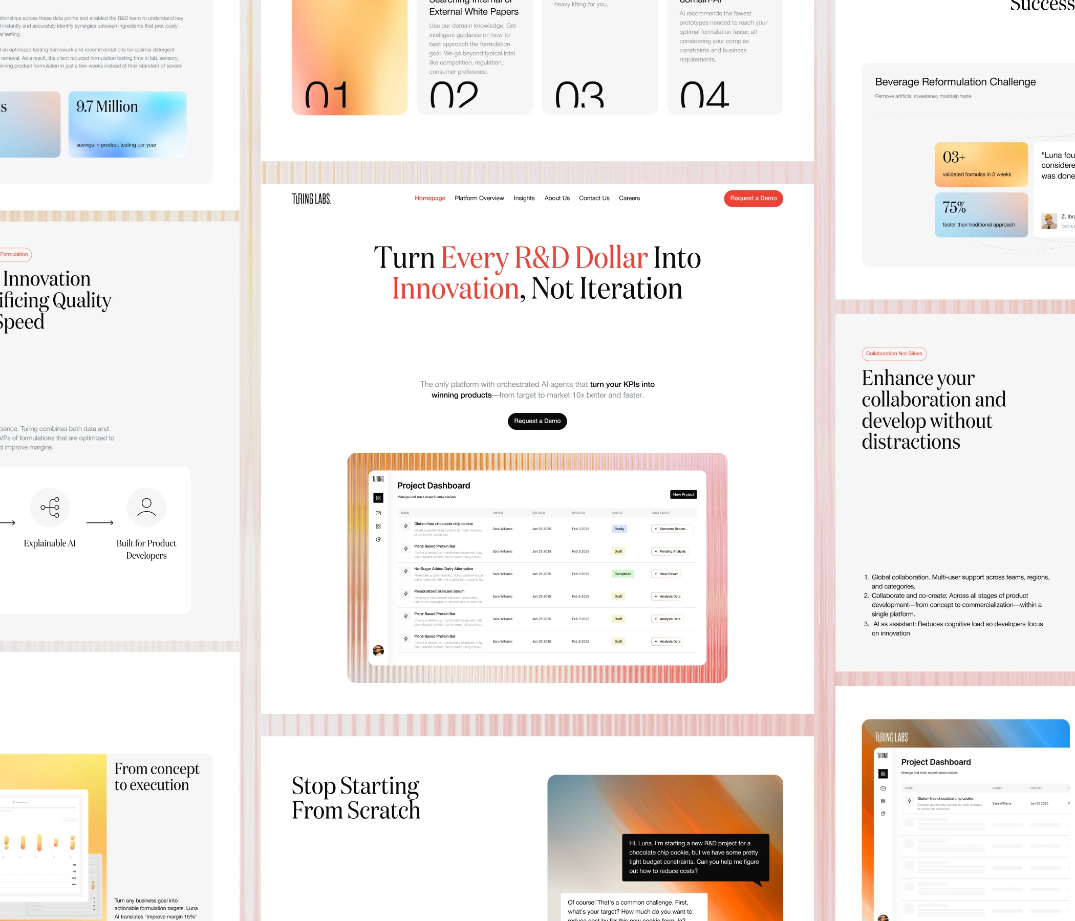 The challenge was to turn a technically complex AI platform into a website experience that felt clear, credible, and enterprise-ready. Turing’s product spans multiple layers—from formulation testing and ingredient intelligence to KPI-driven product development—so the website needed to simplify that complexity without losing depth.