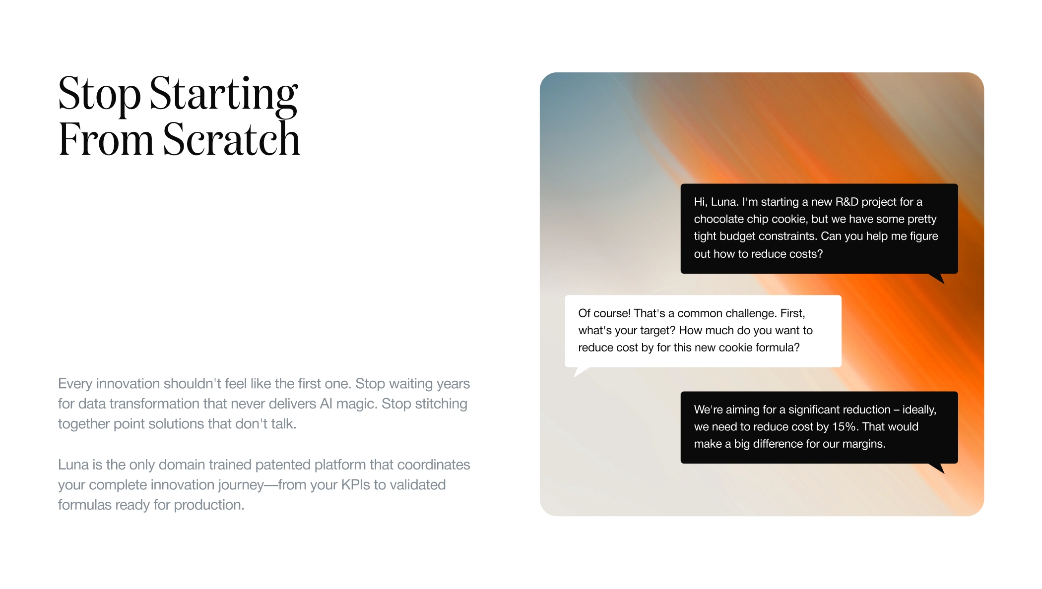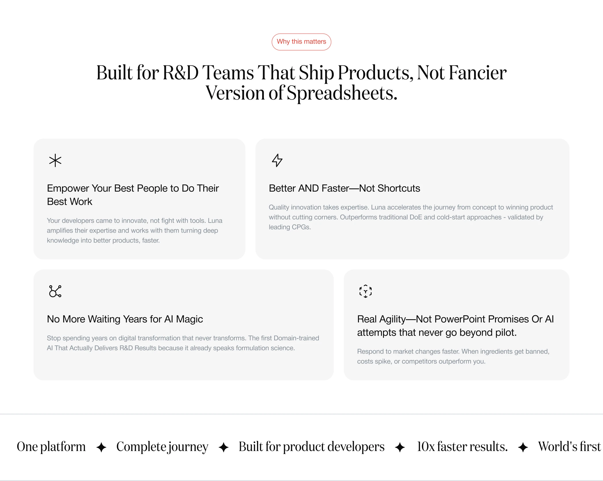 Beyond explaining what the platform does, it also had to communicate why it matters: helping R&D teams move faster, reduce iteration, and respond more effectively to cost, market, and regulatory pressures.