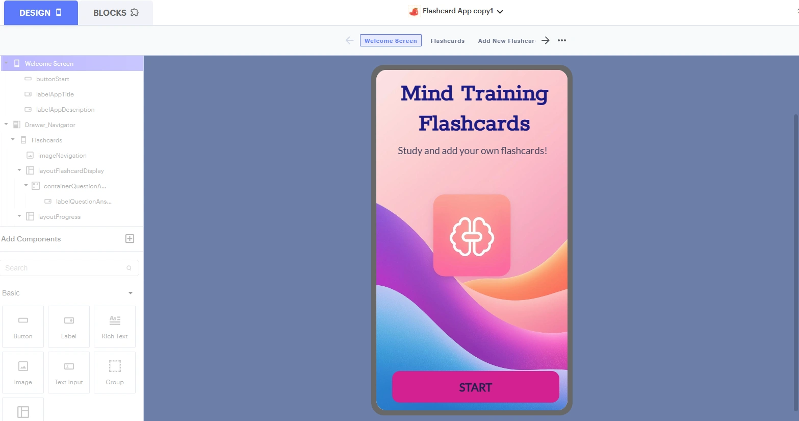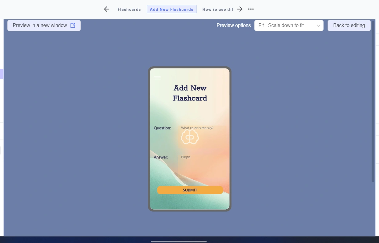 Developed on Thunkable, the app features a clean and intuitive home screen, simple navigation, and dynamic flashcard interactions tailored for mobile use. With customizable categories, users can challenge themselves across different skill areas while staying motivated through gamified elements.