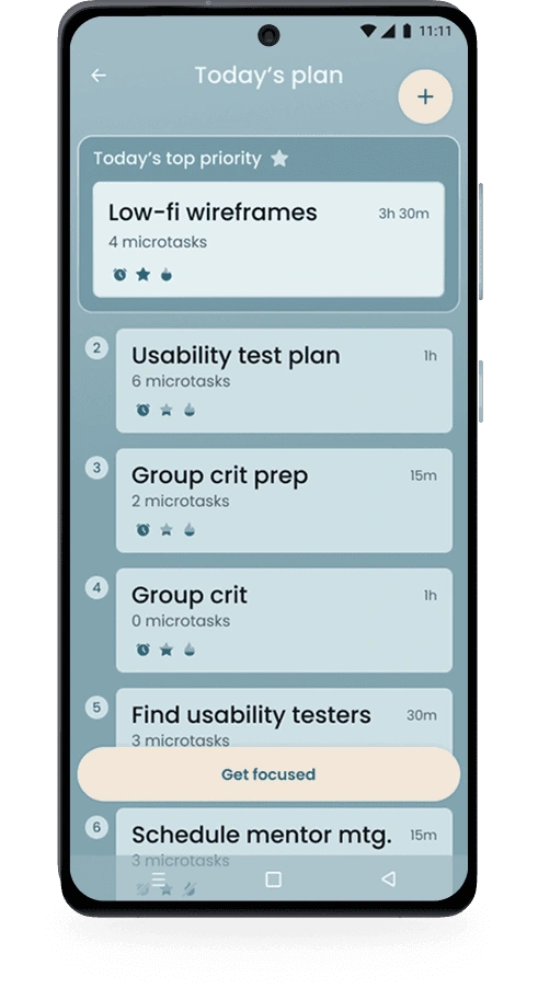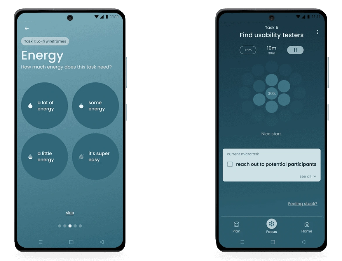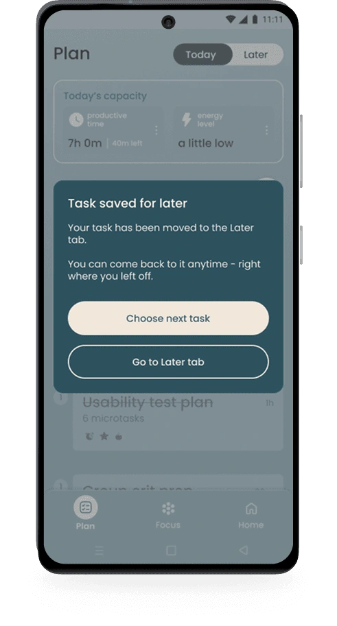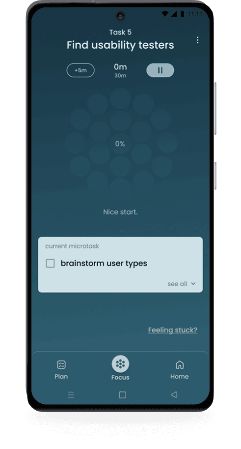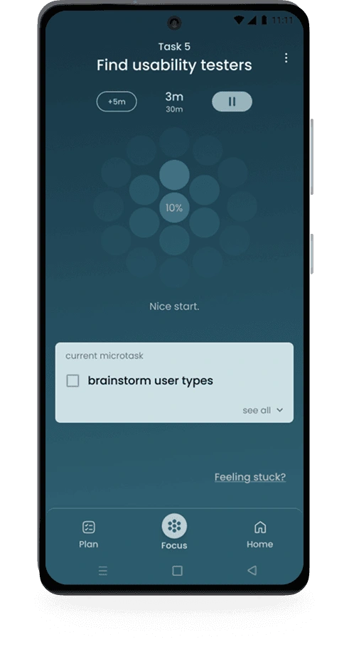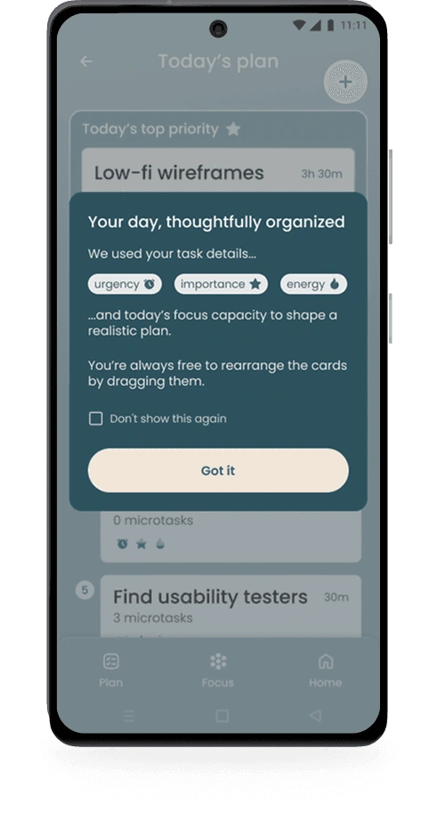 Users begin by unloading everything that’s been floating around in their head, adding light details to each task (urgency, importance, energy, and time) only if it feels helpful. They also have the option to break tasks into microtasks or skip ahead to Focus Mode entirely.