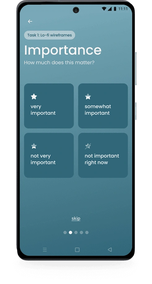 My first version asked users to fill in all task details on one screen: urgency, importance, energy, estimated time. Early feedback made clear this replicated the exact overwhelm I was trying to eliminate. I moved to a one-question-per-screen model, keeping each input fully focused and distraction-free.