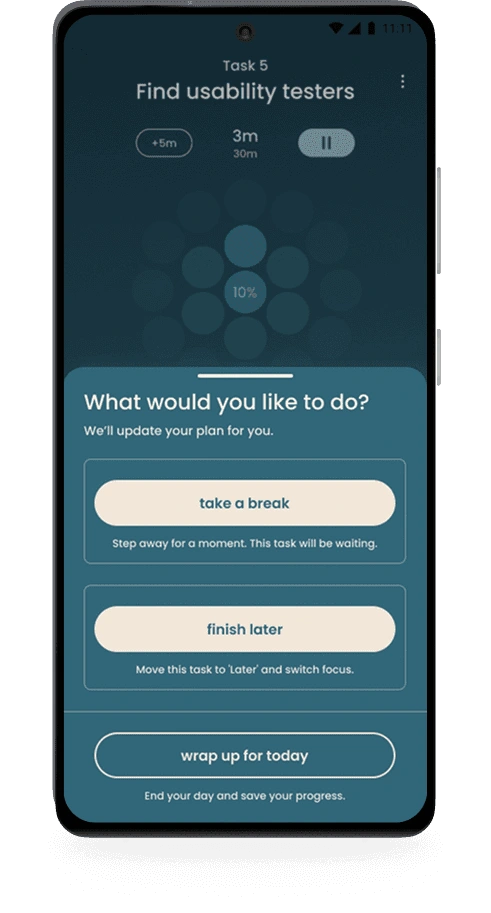 If overwhelm arises, the pause button surfaces three options ordered from least to most disruptive: take a break, finish later, or wrap up for today. The third option uses a secondary button style (visually quieter) to gently discourage closing the app without removing the choice.