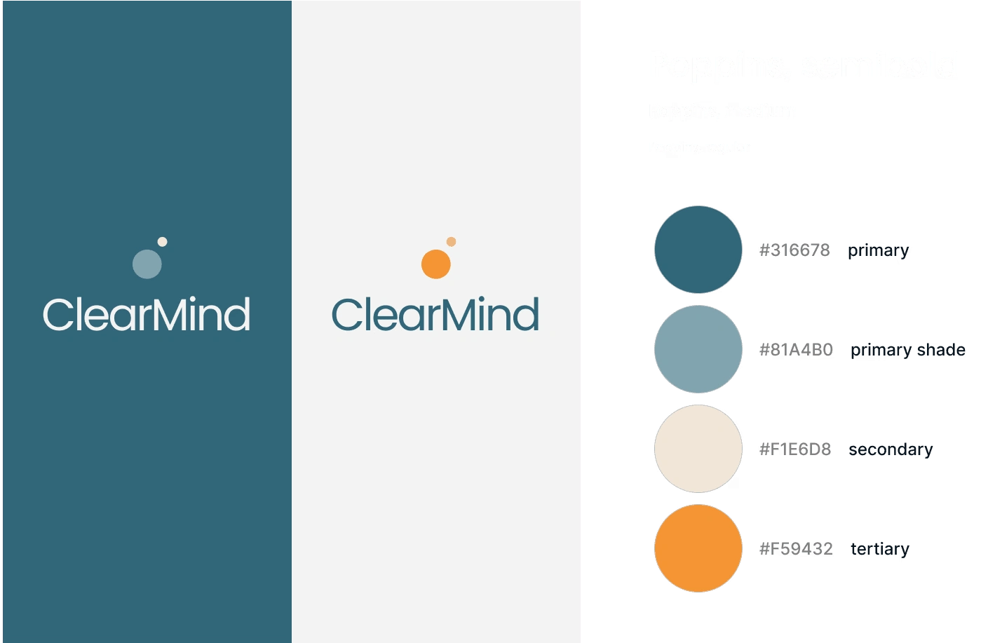 The name ClearMind reflects the app's core goal: moving from mental clutter to clarity. The logo suggests a head with a lighter thought rising outward - a visual metaphor for mental release. The color palette supports focus and emotional regulation, and typography was chosen for warmth and readability above all else.