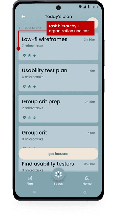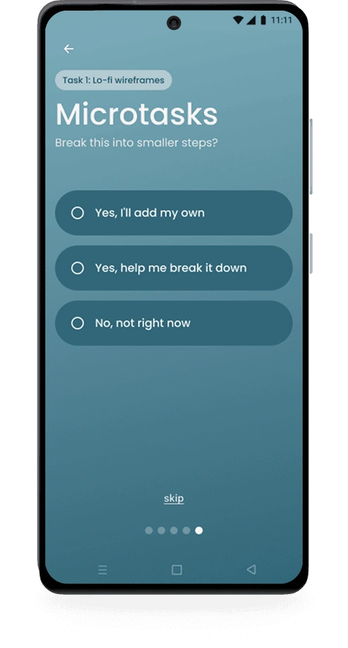 Microtasks emerged from user interviews. Breaking tasks into smaller steps felt more manageable, and each completion moment carries a real dopamine reward for ADHD users. Making microtasks optional kept the experience flexible, never rigid.
