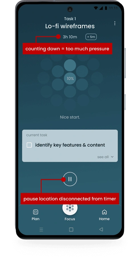 problems: - viewing only the remaining time increased pressure - the pause button felt visually disconnected from the timer solutions: - reframed time as elapsed to promote encouragement - moved the pause control closer to the timer for easier, calmer access