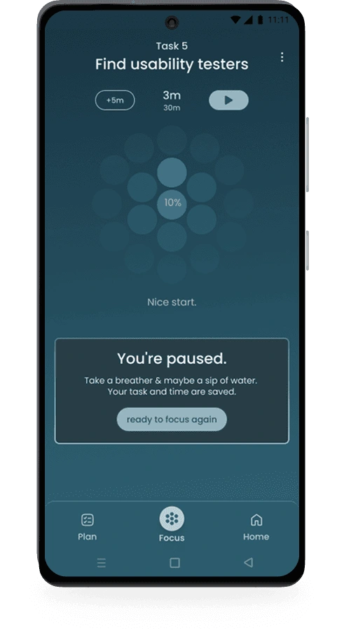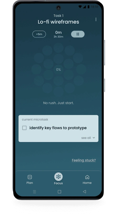 Once users enter Focus Mode, a subtle progress visualization sits at the top of the screen - bold in shape, slow-moving by design - giving users a peripheral sense of momentum without pulling focus. The current microtask occupies the visual center, set in light color against a dark background to draw the eye naturally. Gentle motivation messages shift as progress continues (no rush / just start / still on track...), present enough to encourage, subtle enough not to distract.