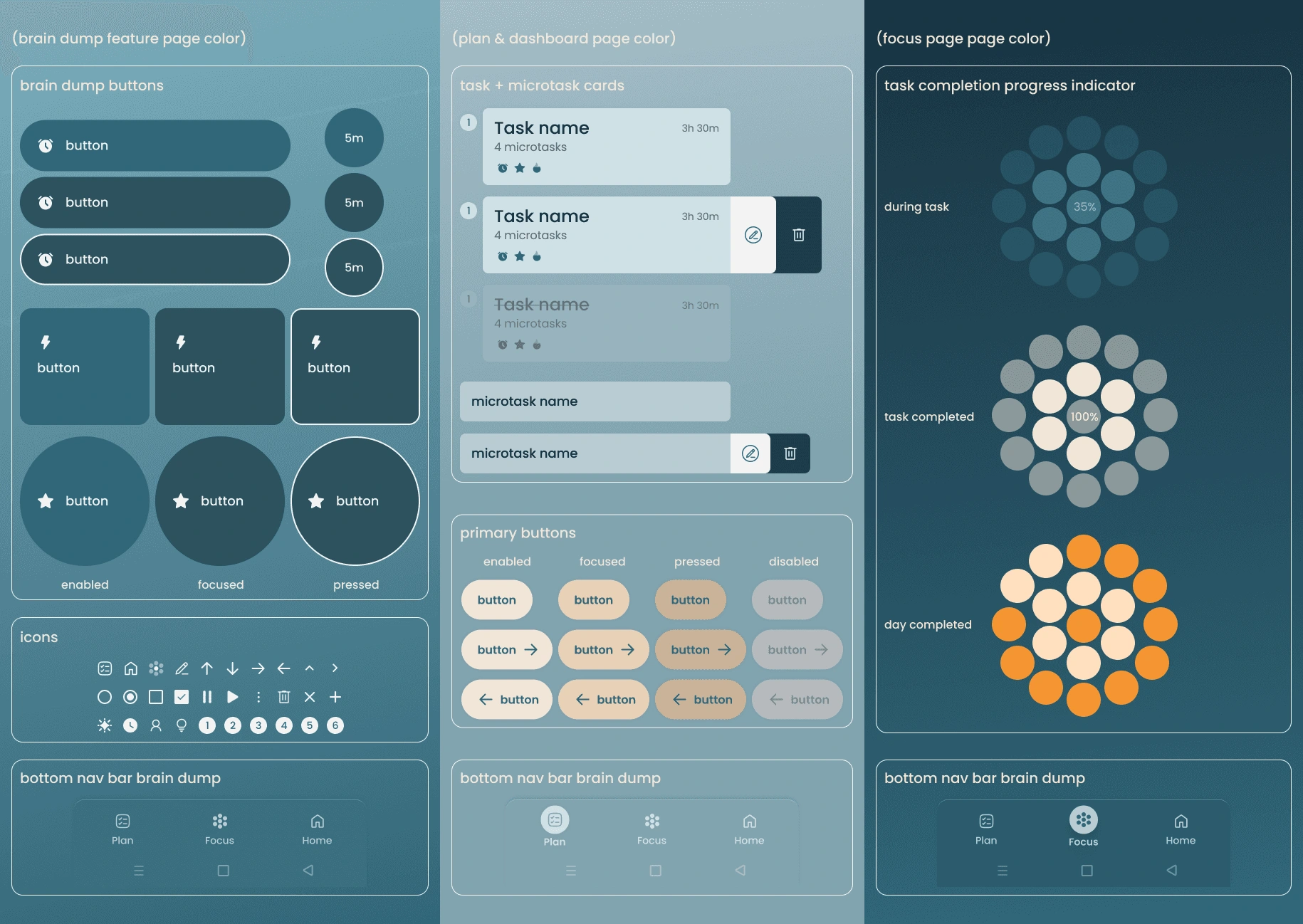 The central design challenge was holding four competing requirements in balance: emotionally sensitive, hyper-focused, subtly interesting, and visually calm. Too much warmth and the app feels precious. Too much restraint and it feels cold. Too much visual interest and it overstimulates the very users it's trying to help. This was a Goldilocks project: everything had to be just right. The biggest expression of that tension was the Brain Dump detail flow. Moving from all task details on one screen to one detail per screen was a risky call - each screen had to be fast, frictionless, and clear. The language had to guide without over-explaining, and the visual design had to feel worth the journey. Focus Mode presented a similar challenge: determining what deserved the user's primary attention at every moment, and making that hierarchy feel intuitive rather than imposed.