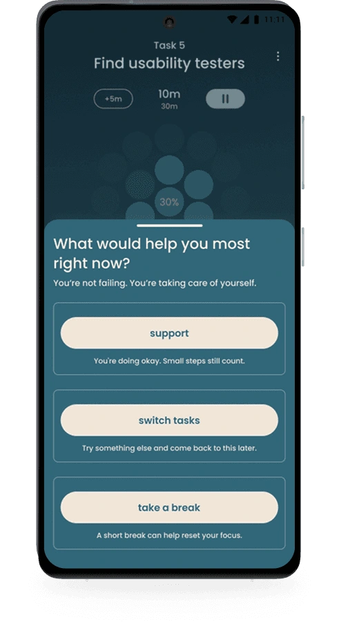 This wasn't an abstract design challenge, it was a chance to build something genuinely useful for a community I'm part of. I wanted to make the daily experience of living with ADHD feel a little lighter, starting with the moment you sit down to figure out what to do next.