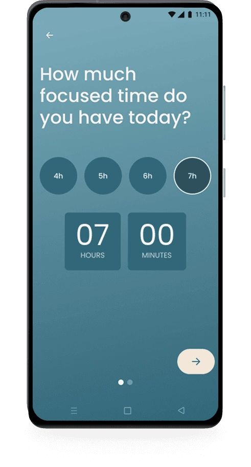 From there, users check in on their available time and energy for the day. The system uses this context to generate a realistic plan and surface the single most relevant task to start, leading naturally into Focus Mode.
