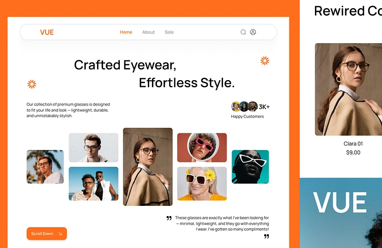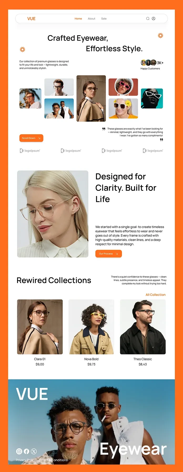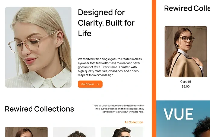 Eyewear that prioritizes timelessness, comfort, and minimalism. With a clean side-by-side layout, the left image focuses on human connection through close-up product photography, while the right copy emphasizes clarity of vision and clarity of design.