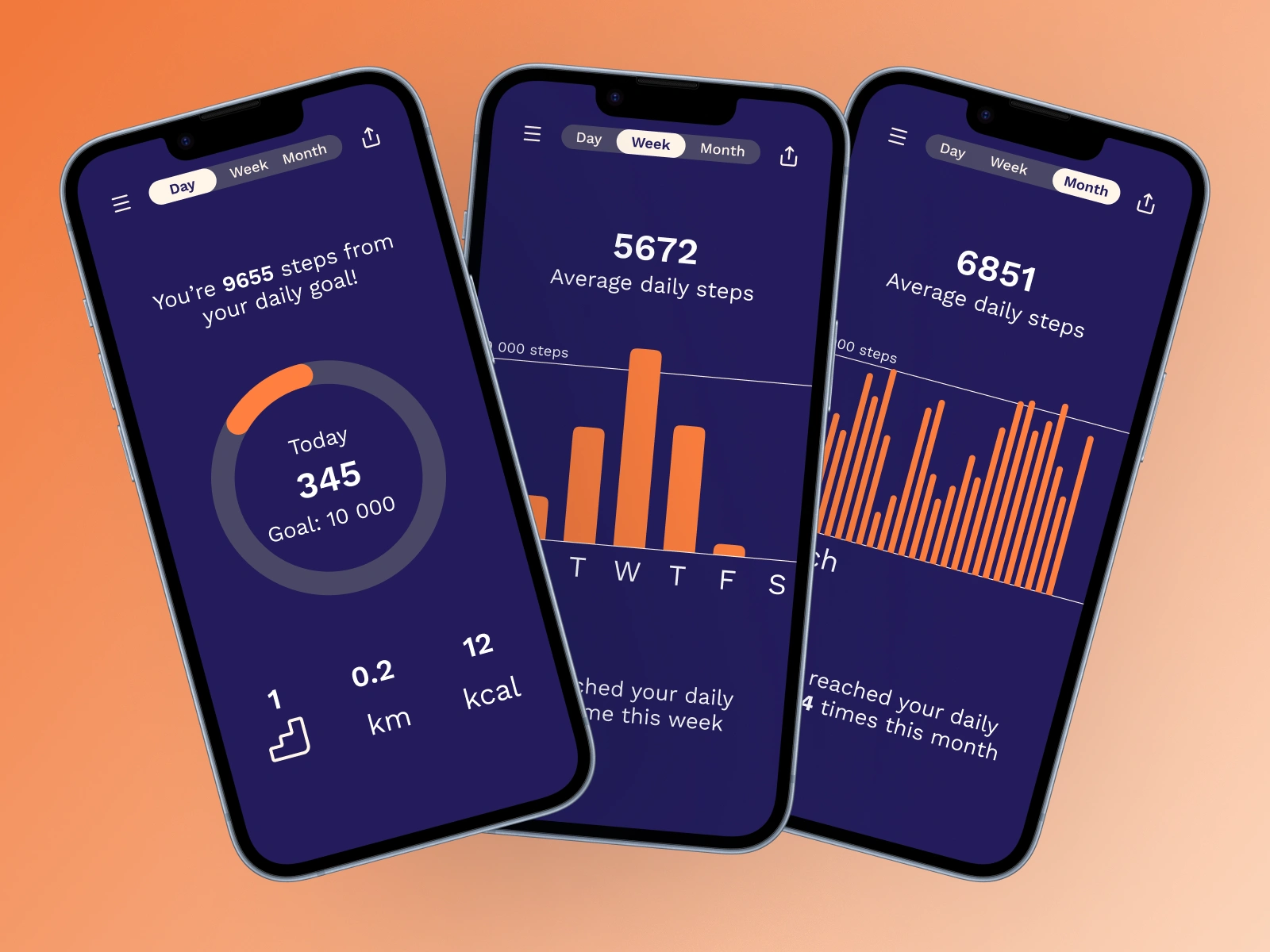 This is a step tracking app that helps users see how many steps they walk every day, week, and month. The goal was to make a catchy, yet simple design, showing the daily steps, distance walked and calories burned. This way, the user easily opens the app and sees their progress!