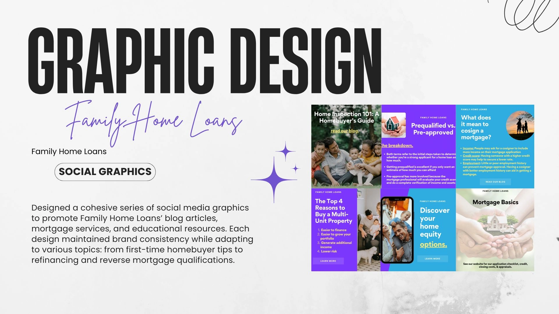 Designed a cohesive series of social media graphics to promote Family Home Loans’ blog articles, mortgage services, and educational resources. Each design maintained brand consistency while adapting to various topics: from first-time homebuyer tips to refinancing and reverse mortgage qualifications.
