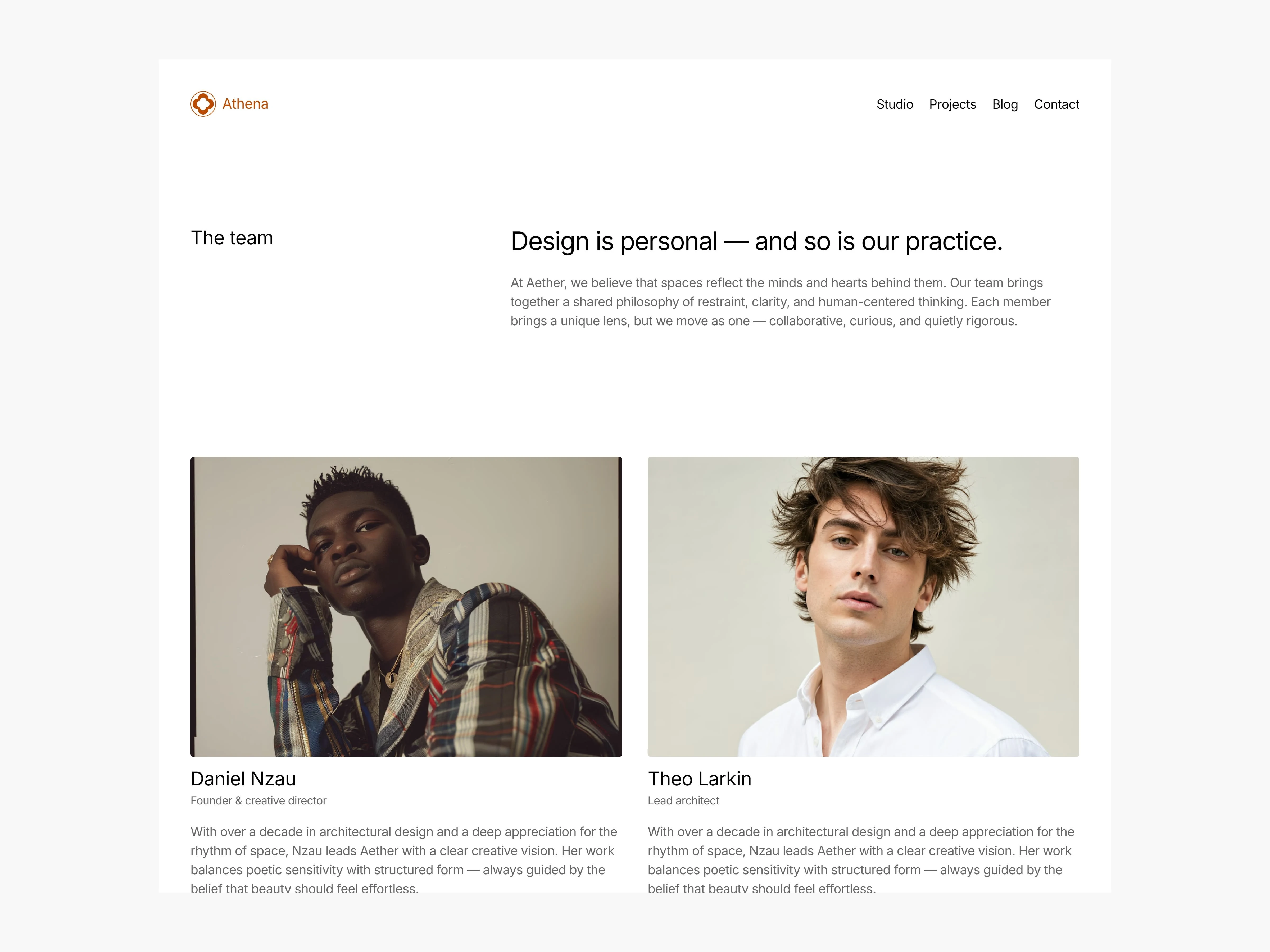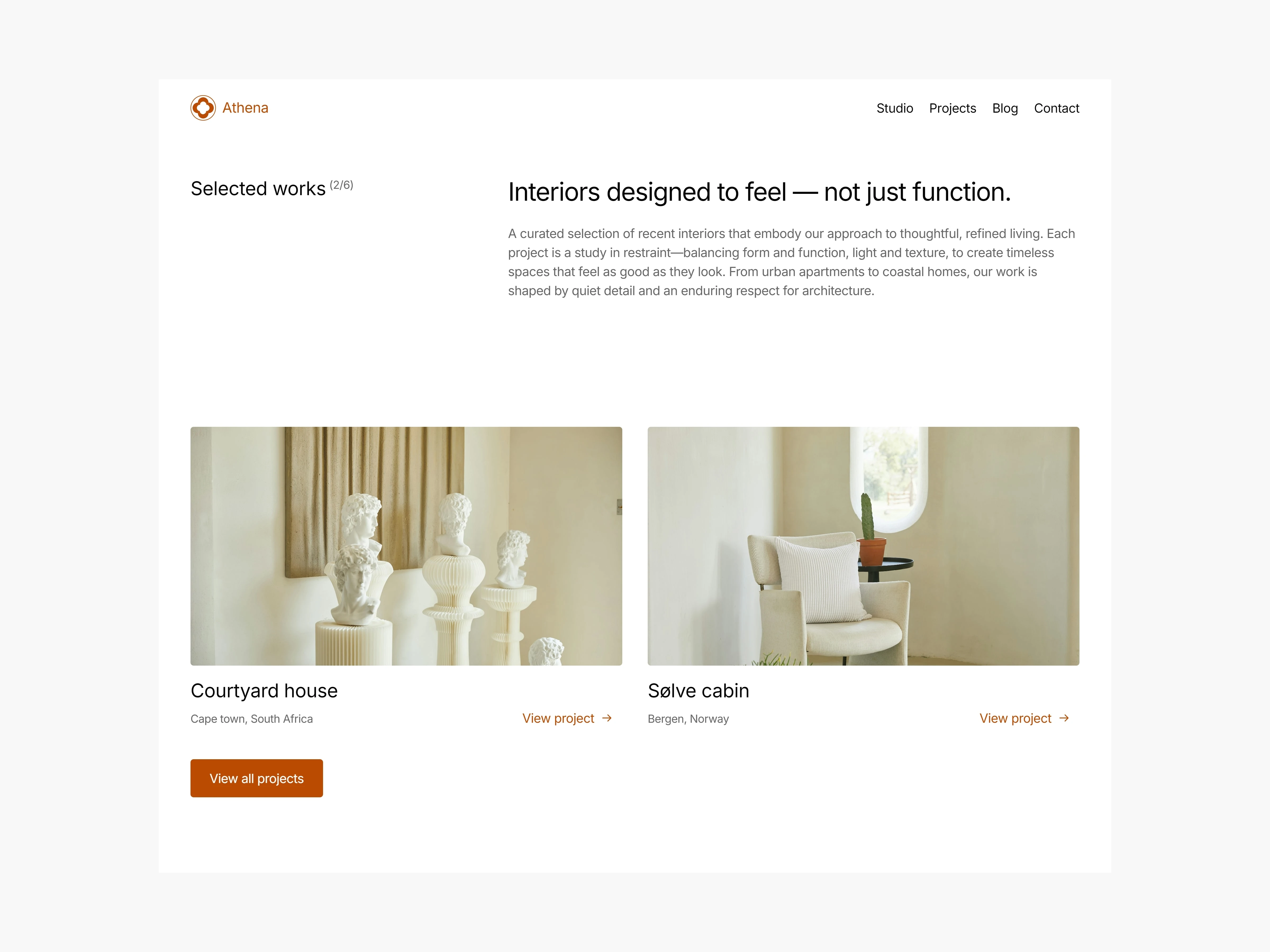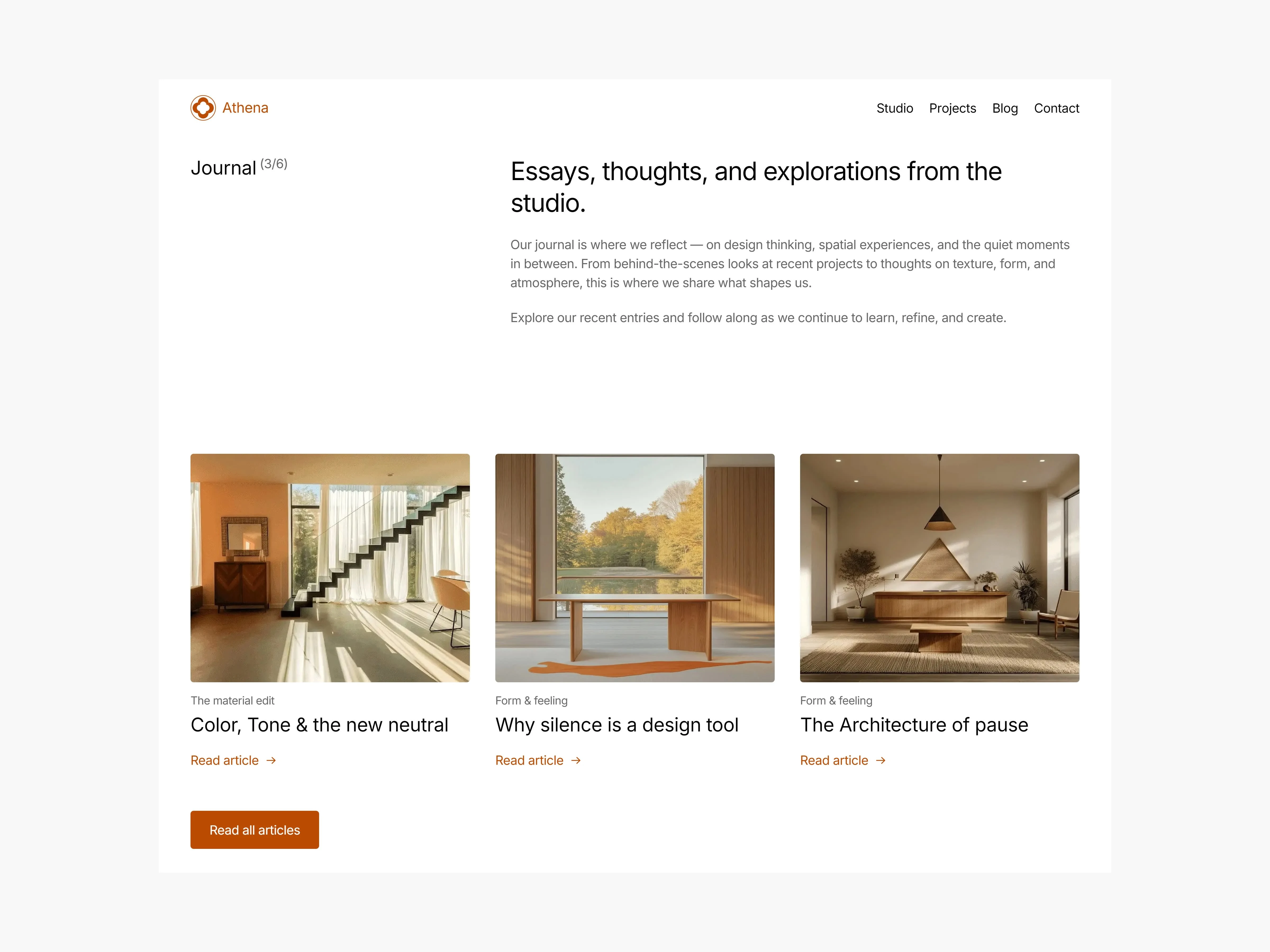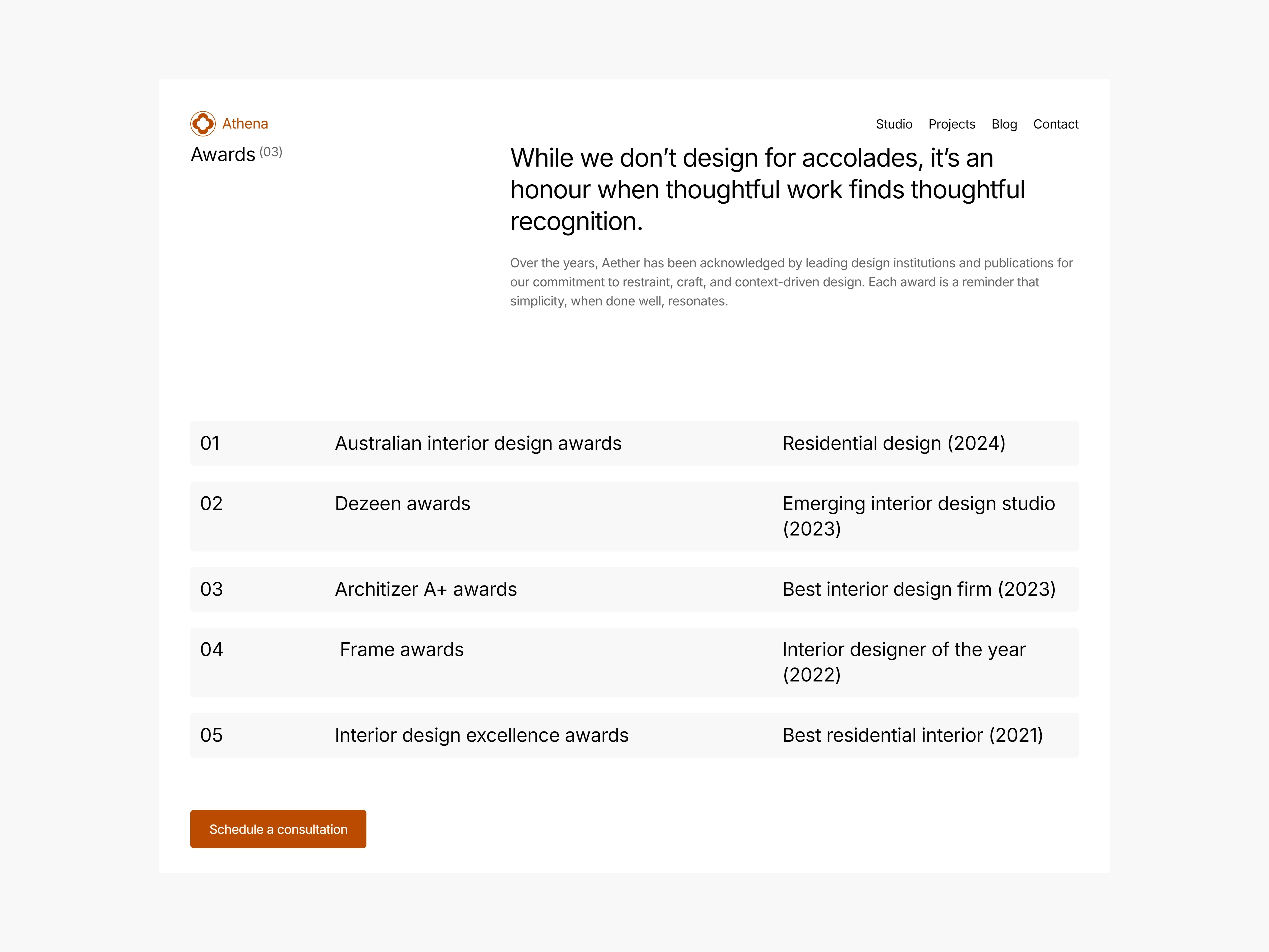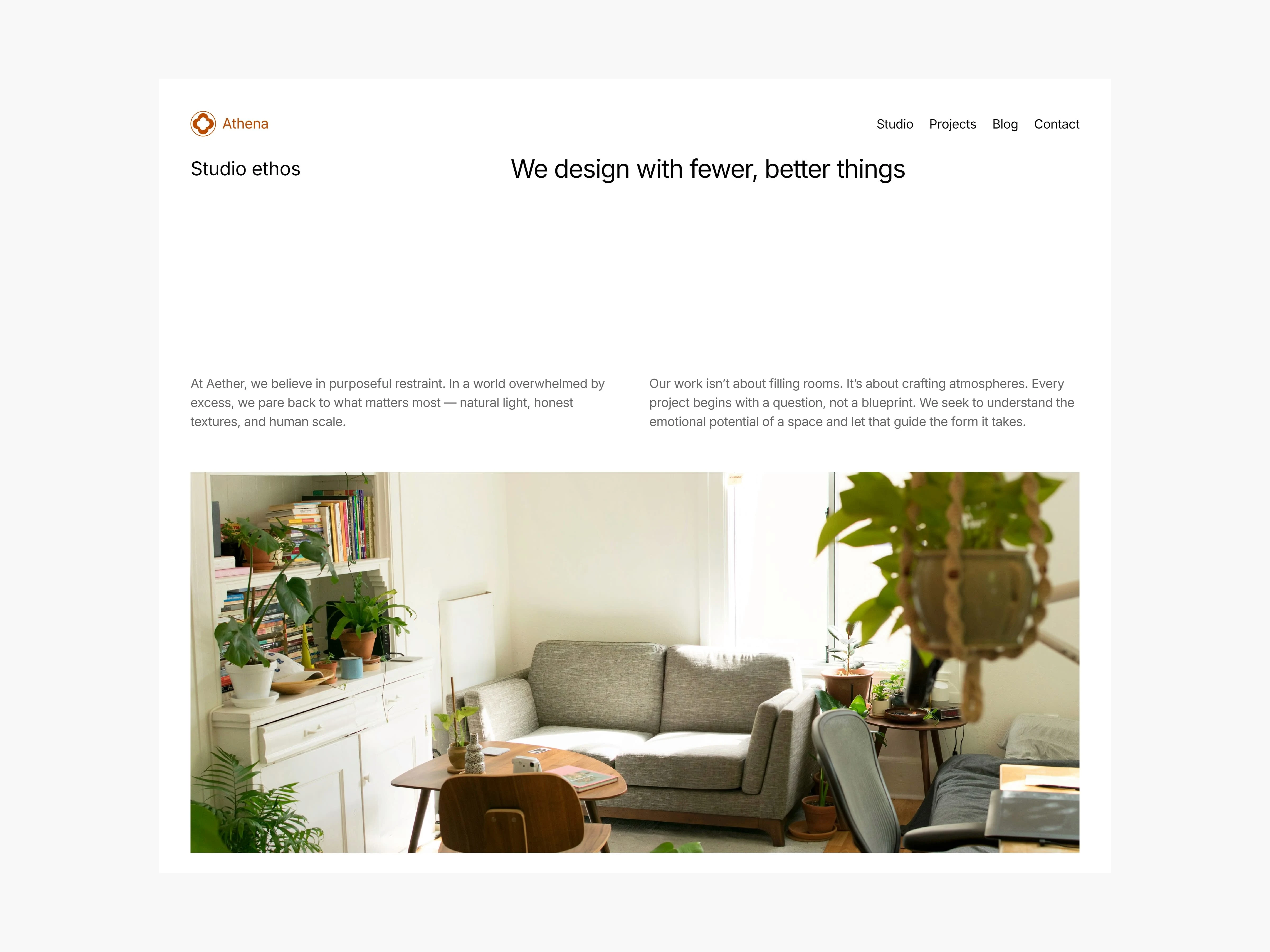 This project explored how an interior practice can present its work online without overpowering it — allowing light, texture, and composition to remain the focal point. Aether was designed as a digital counterpart to well-considered interiors: minimal, intentional, and quietly confident.