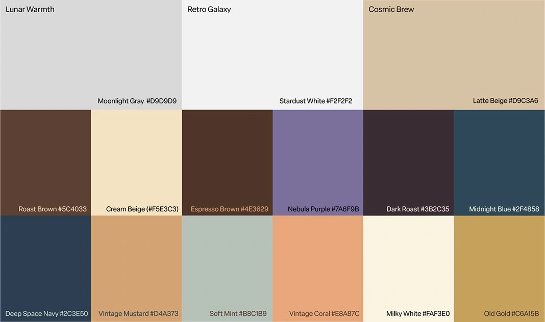 Lunar Warmth: A mix of Moonlight Gray (#D9D9D9), Roast Brown (#5C4033), Cream Beige (#F5E3C3), Deep Space Navy (#2C3E50), and Vintage Mustard (#D4A373)—perfect for a welcoming, earthy feel.