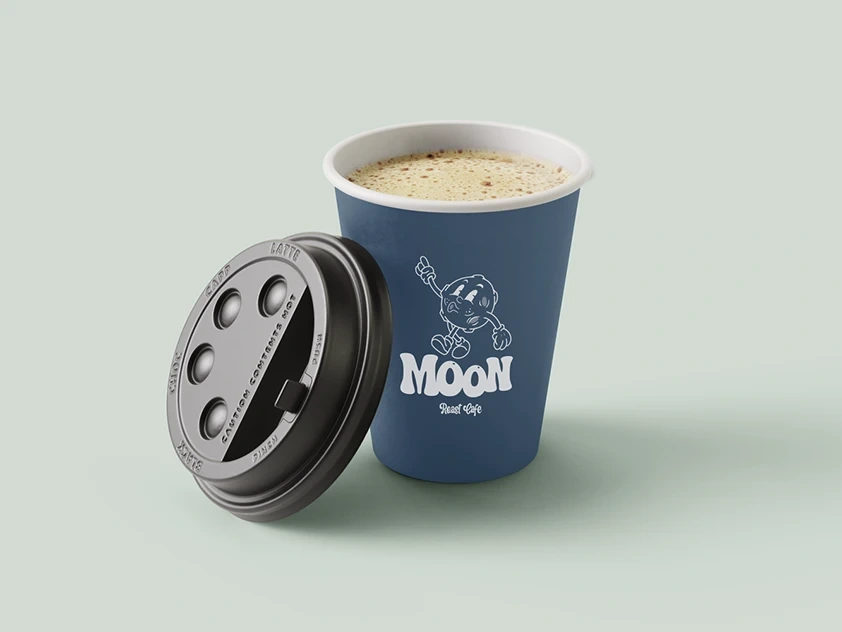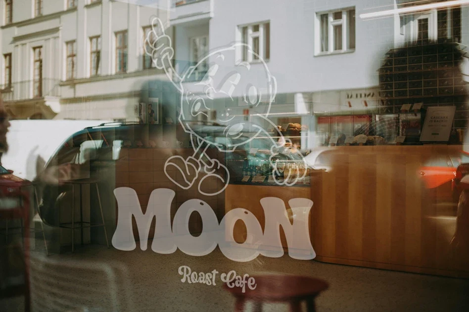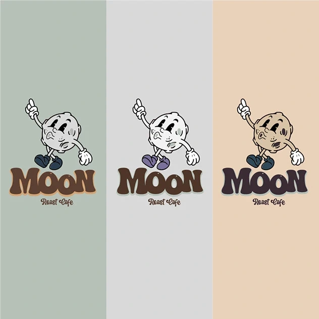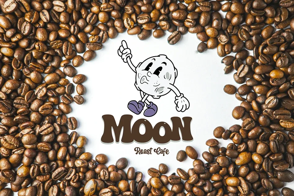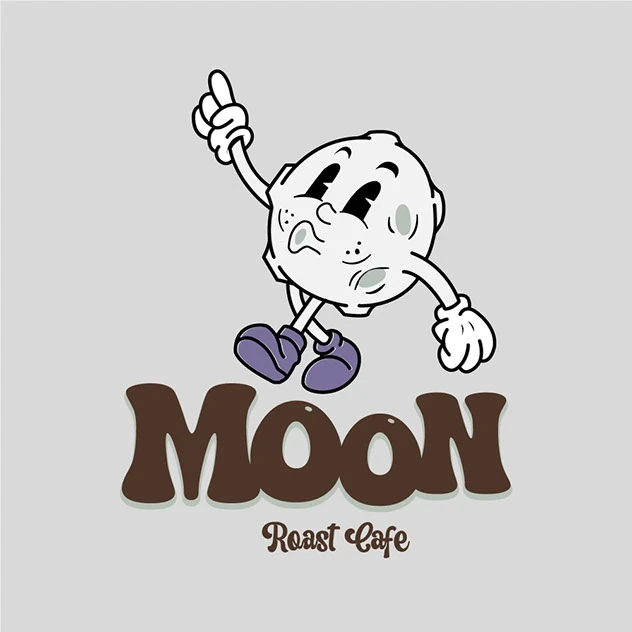 The branding for Moon Roast Cafe blends retro aesthetics with space-inspired elements, evoking a sense of warmth and wonder. The logo features a vintage-style typeface with subtle astronomical motifs, capturing the café's cozy yet adventurous vibe.