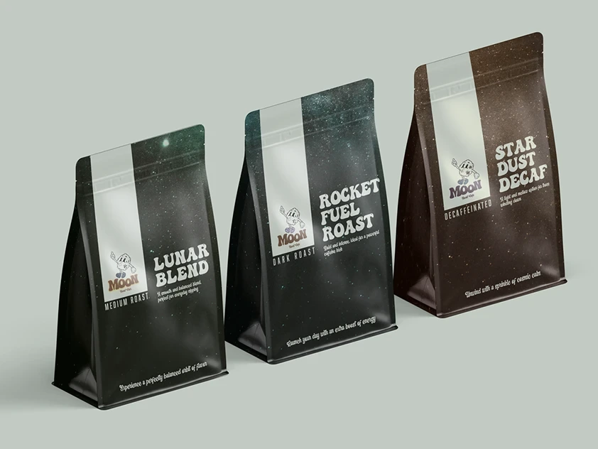 I designed packaging for both coffee cups and coffee bean bags, incorporating the brand's visual elements and colour schemes. The designs integrate the space theme through custom illustrations and patterns, creating a distinctive look that stands out while maintaining functionality and appeal.
