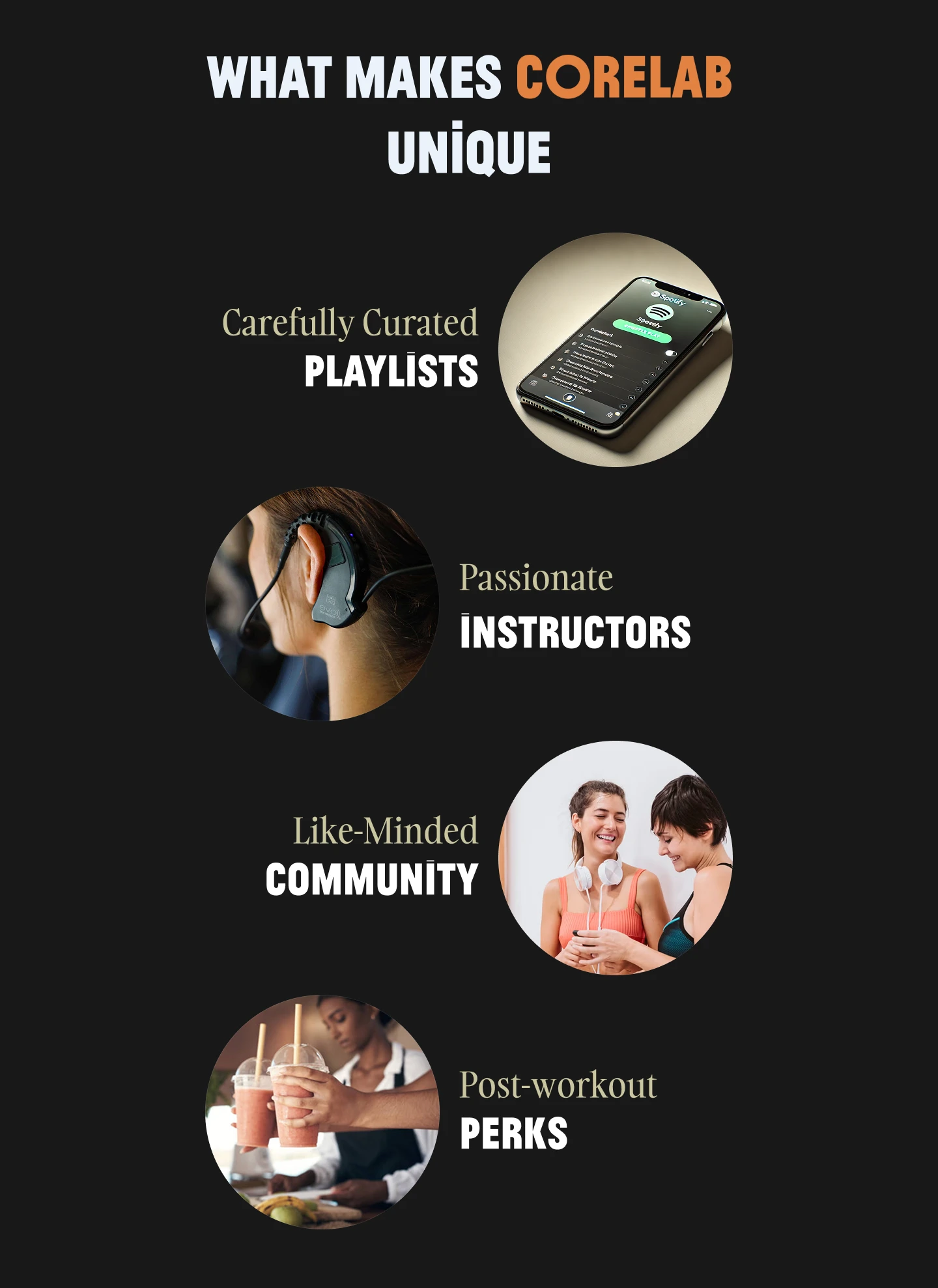 A visual showcase of what makes the studio different — from curated music and expert instructors to a supportive community and thoughtful perks — all organized in a branded grid.