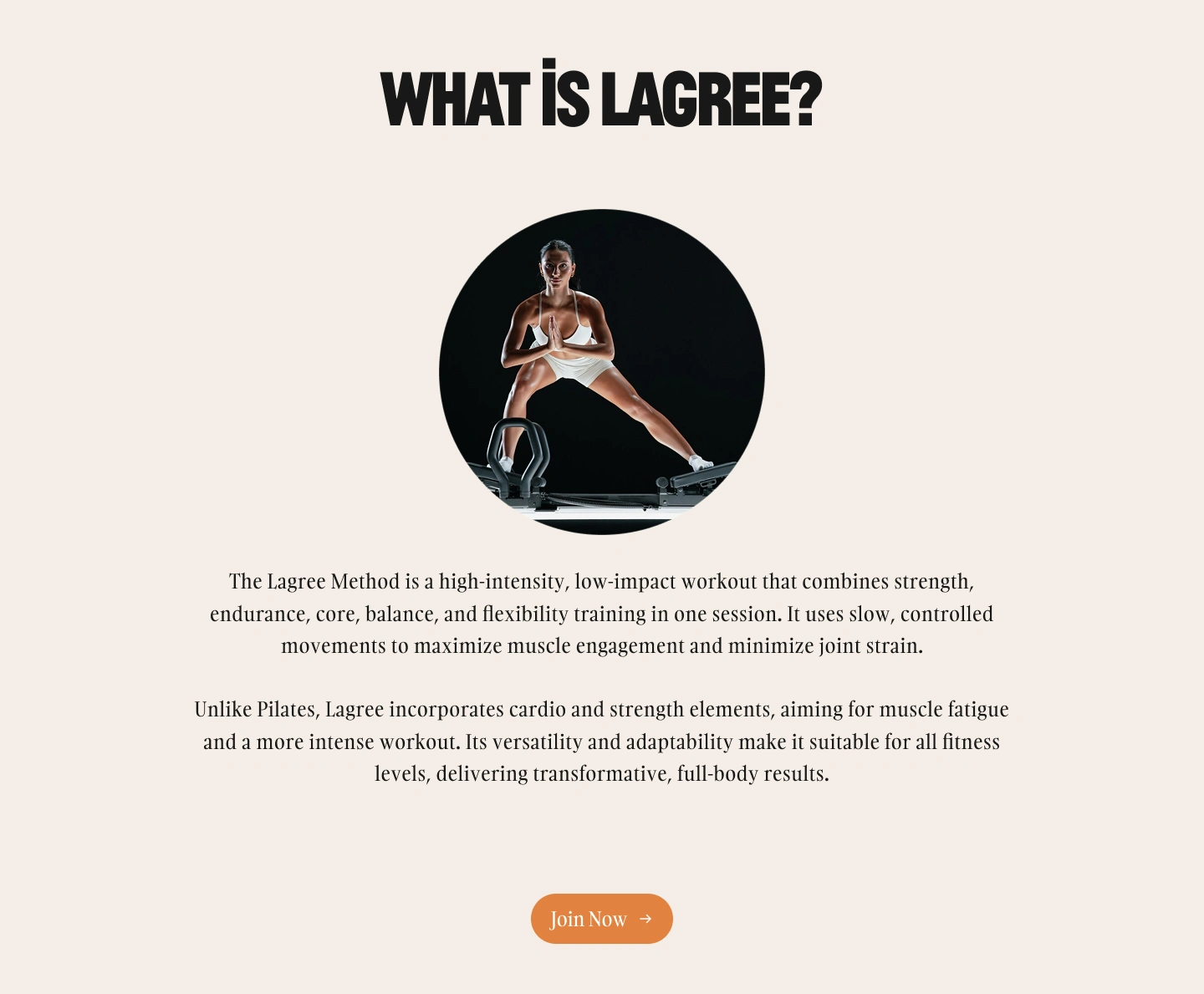 This section introduces the Lagree method, highlighting its low-impact, high-intensity approach. The visual and centered layout keeps the focus on education while remaining visually clean.