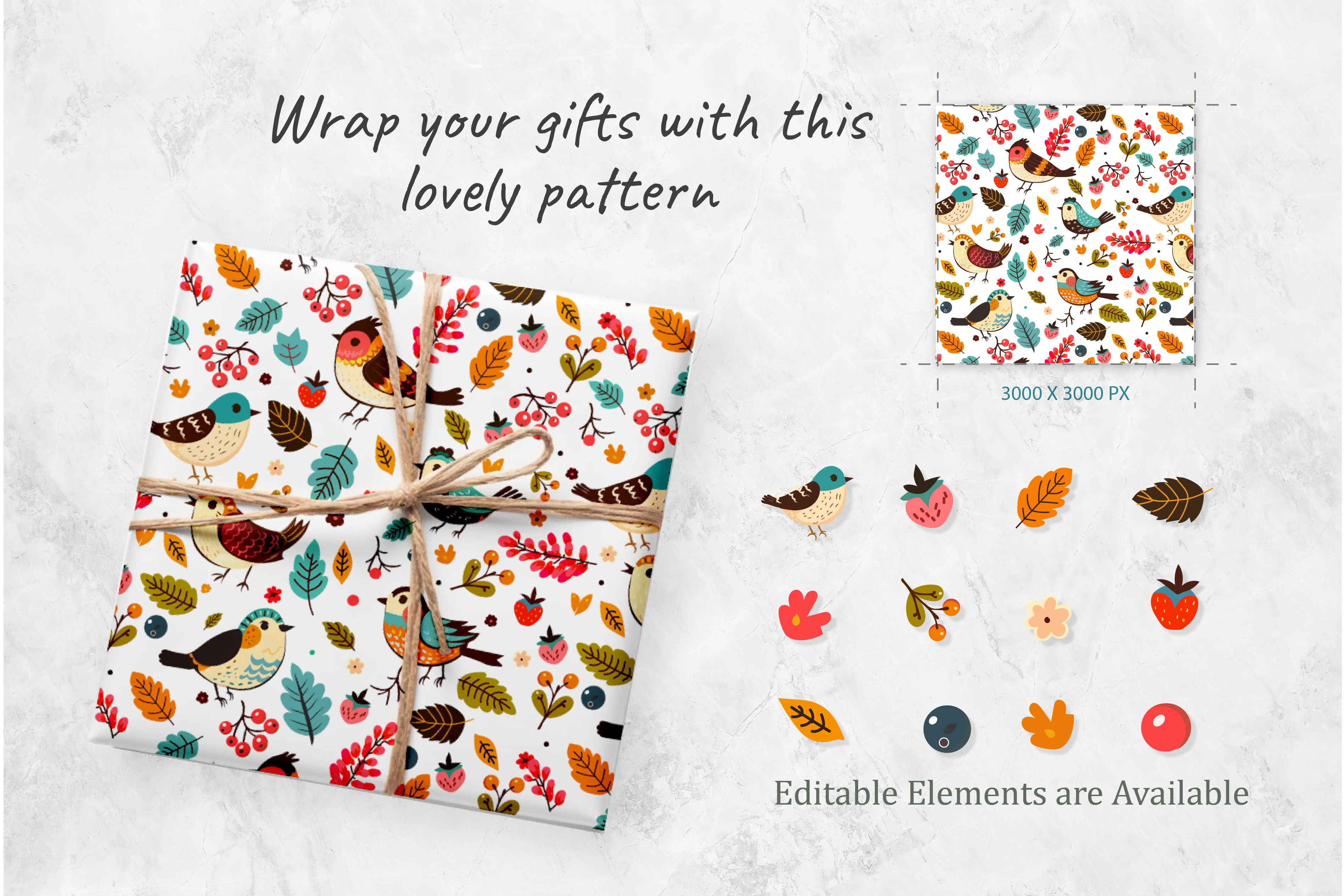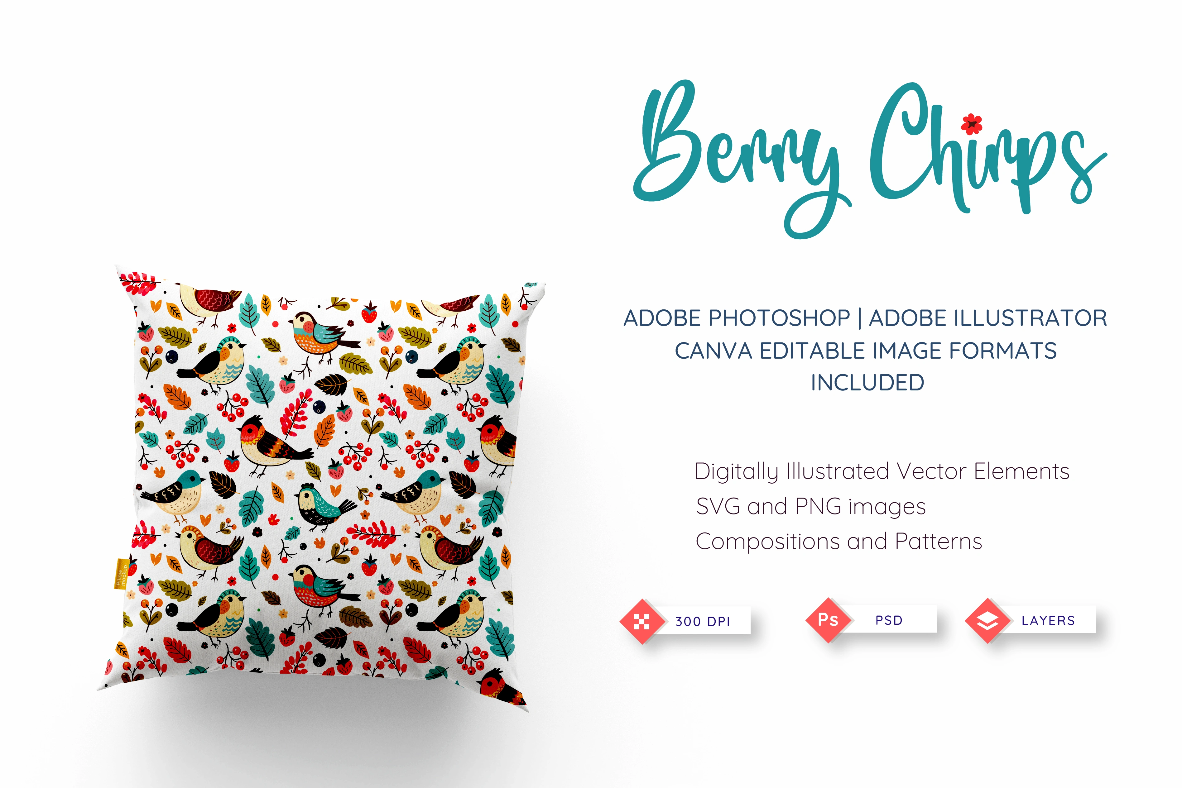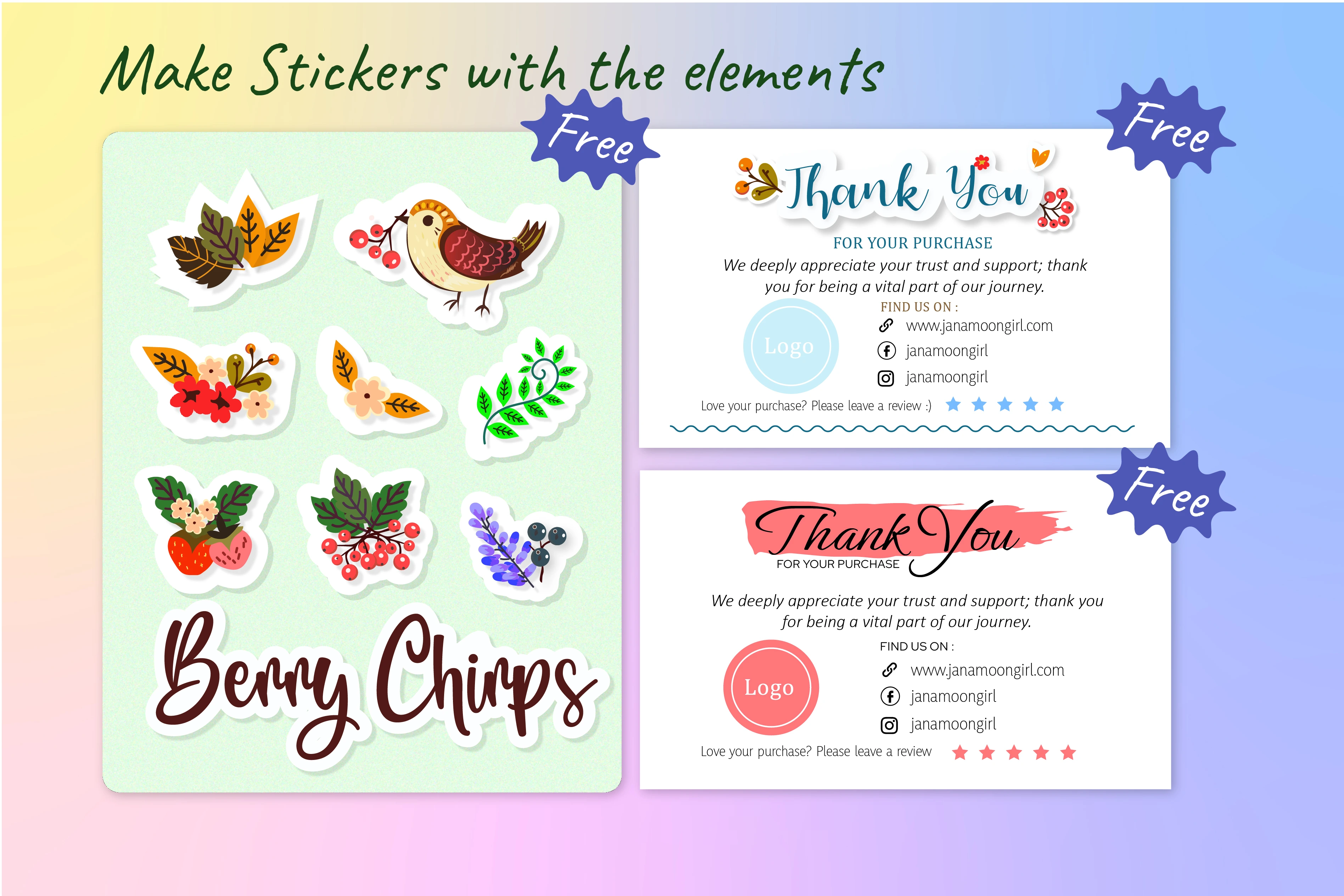 Get creative with my bright and beautiful bird and berry patterns. Perfect for cards, t-shirts, home décor, and more. Includes easy-to-edit files in AI, EPS, SVG, PNG, and PSD formats. Plus, get a free sticker and two thank you cards. Download now and start designing!