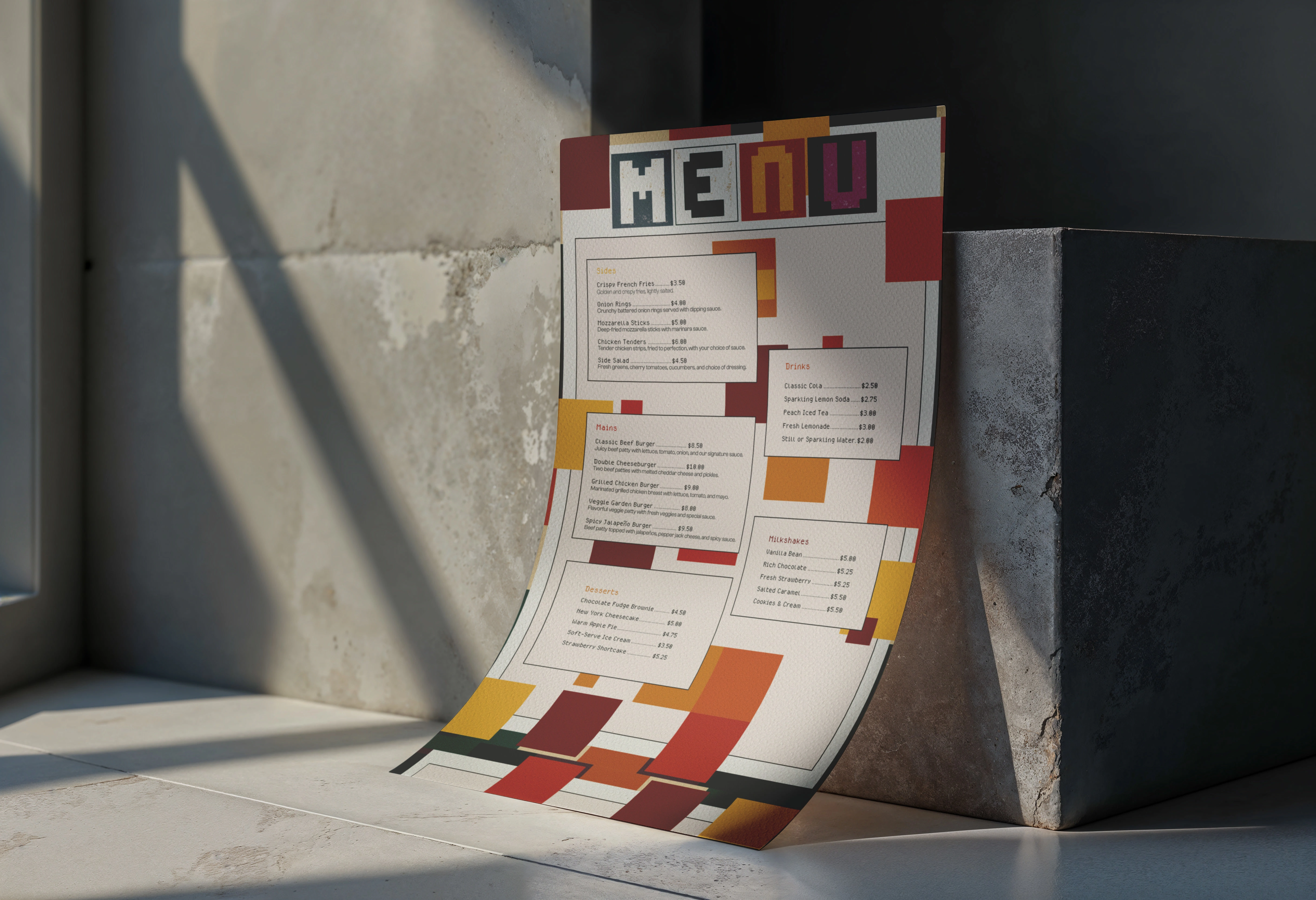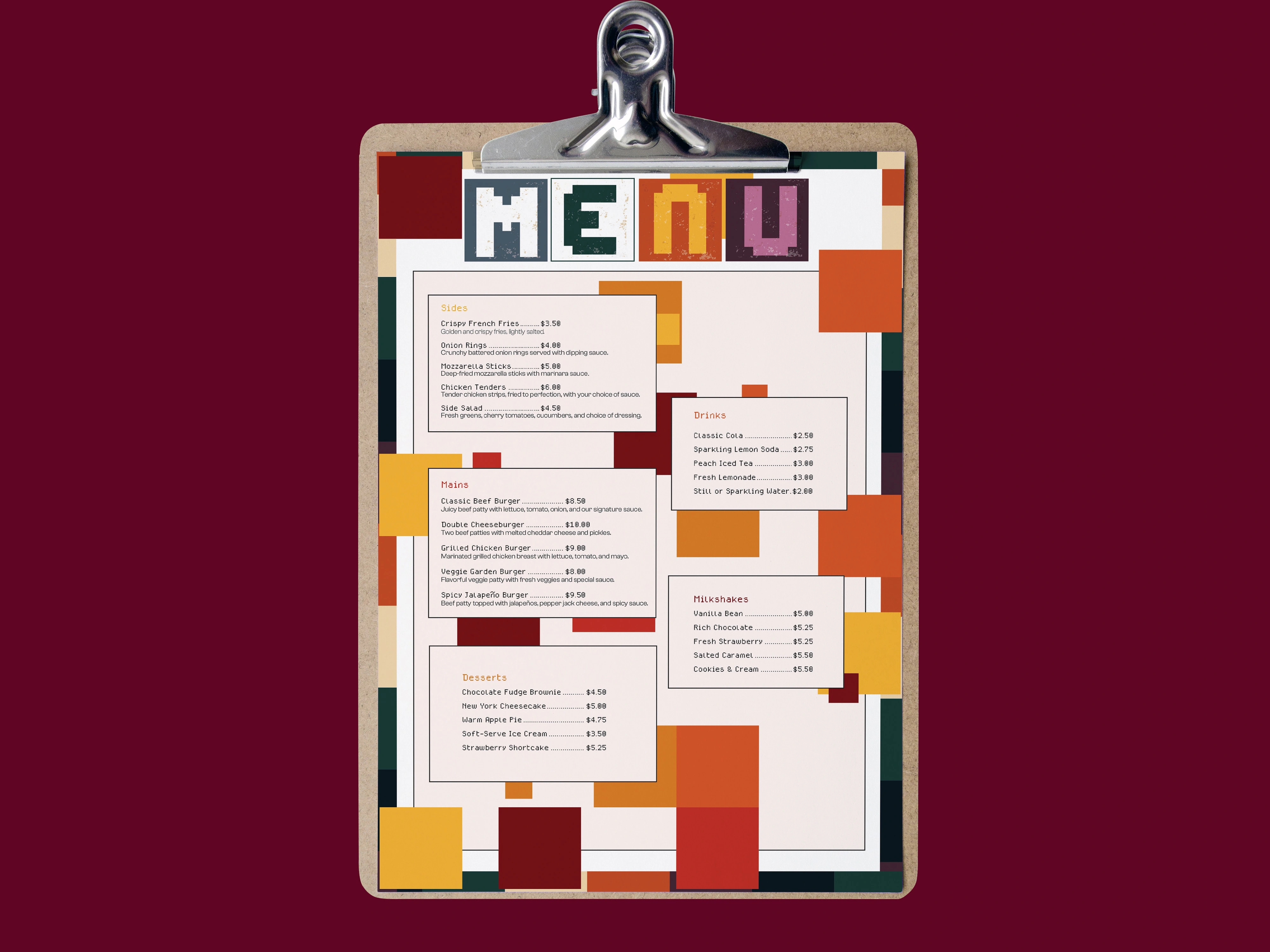 Retro Diner Menu. For this menu concept, I moved away from traditional layouts to create a high-impact, geometric aesthetic. The design uses a digital-meets-analog style, combining a textured paper feel with bold, blocky color fields and pixel-inspired typography. This embrace a brand identity that is vibrant, energetic, and nostalgic.