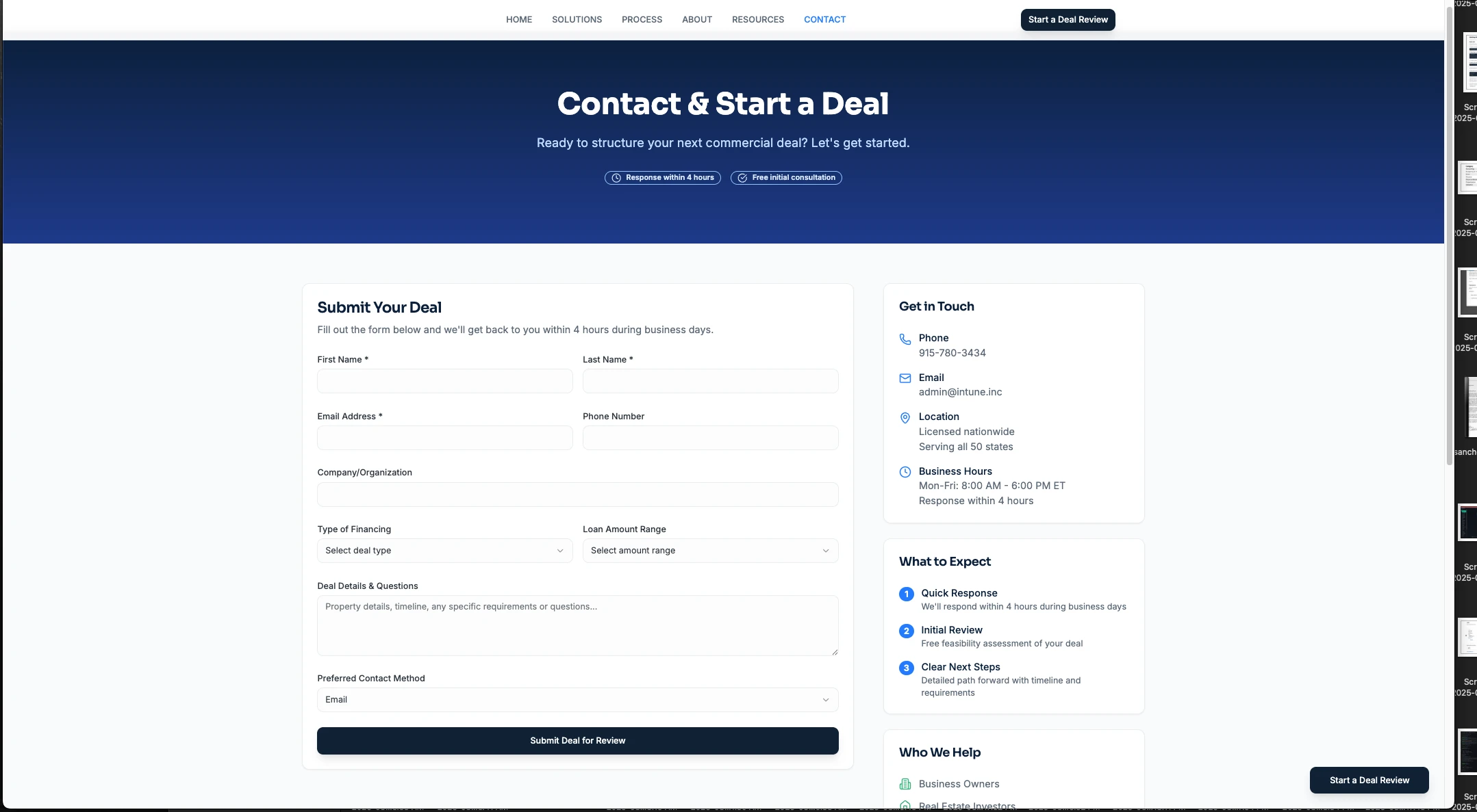 Commercial Deal Intake Form A professional web-based intake system where clients can submit deal details (loan type, range, usage, etc.), track status, and get quick responses. Includes admin tools for reviewing, approving, or rejecting deals.