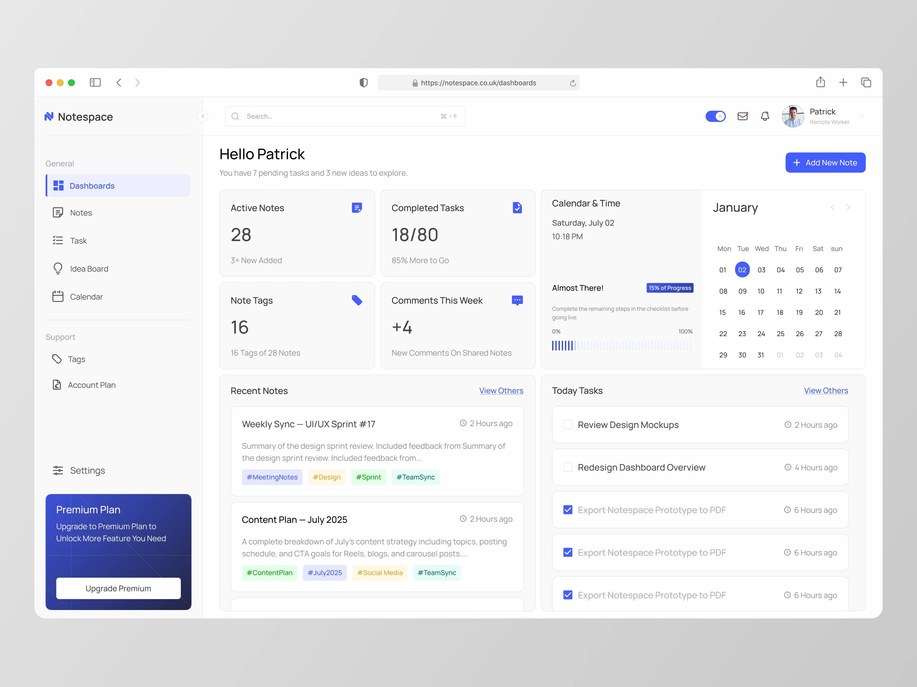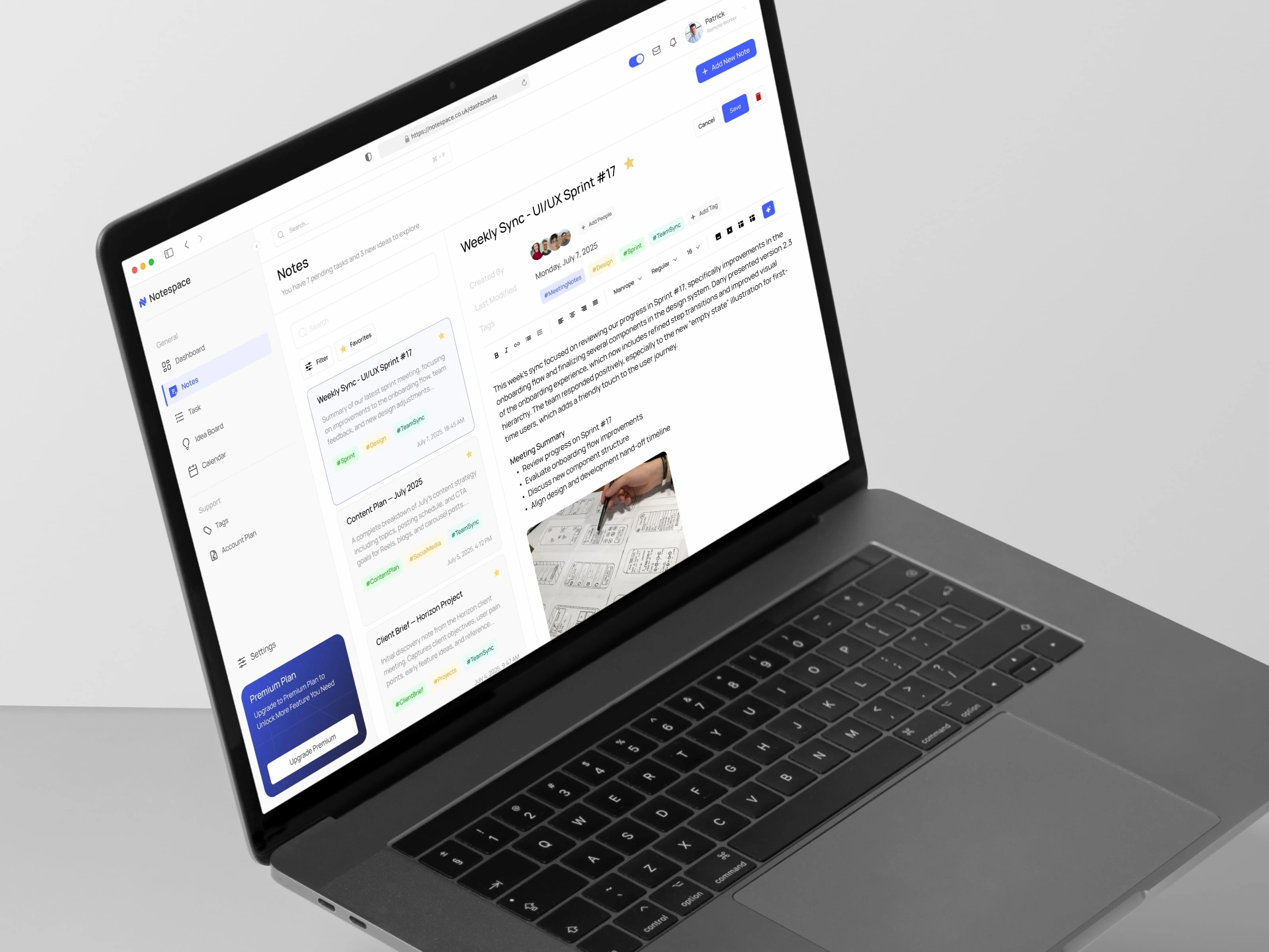 Notespace was created as a concept to explore how a modern workspace could bring clarity to everyday thinking. Our goal was to design a dashboard where notes, tasks, and ideas feel naturally connected — helping users stay organized without losing creativity.