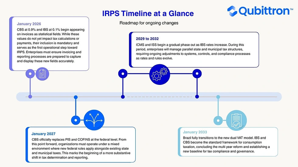 Timeline graphic titled “IRPS Timeline at a Glance” showing key phases of Brazil’s tax reform from January 2026 through January 2033, including the introduction of CBS and IBS fields, replacement of legacy federal taxes, a multi-year transition period, and full adoption of the dual VAT model, branded by Qubittron.