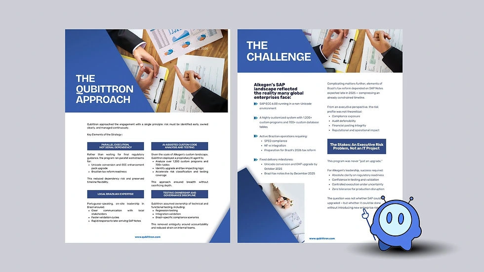 Two-page visual preview of a Qubittron SAP transformation use case, highlighting enterprise challenges, regulatory complexity, risk management, and Qubittron’s structured approach to SAP modernization and compliance, presented as a teaser for a detailed case study.