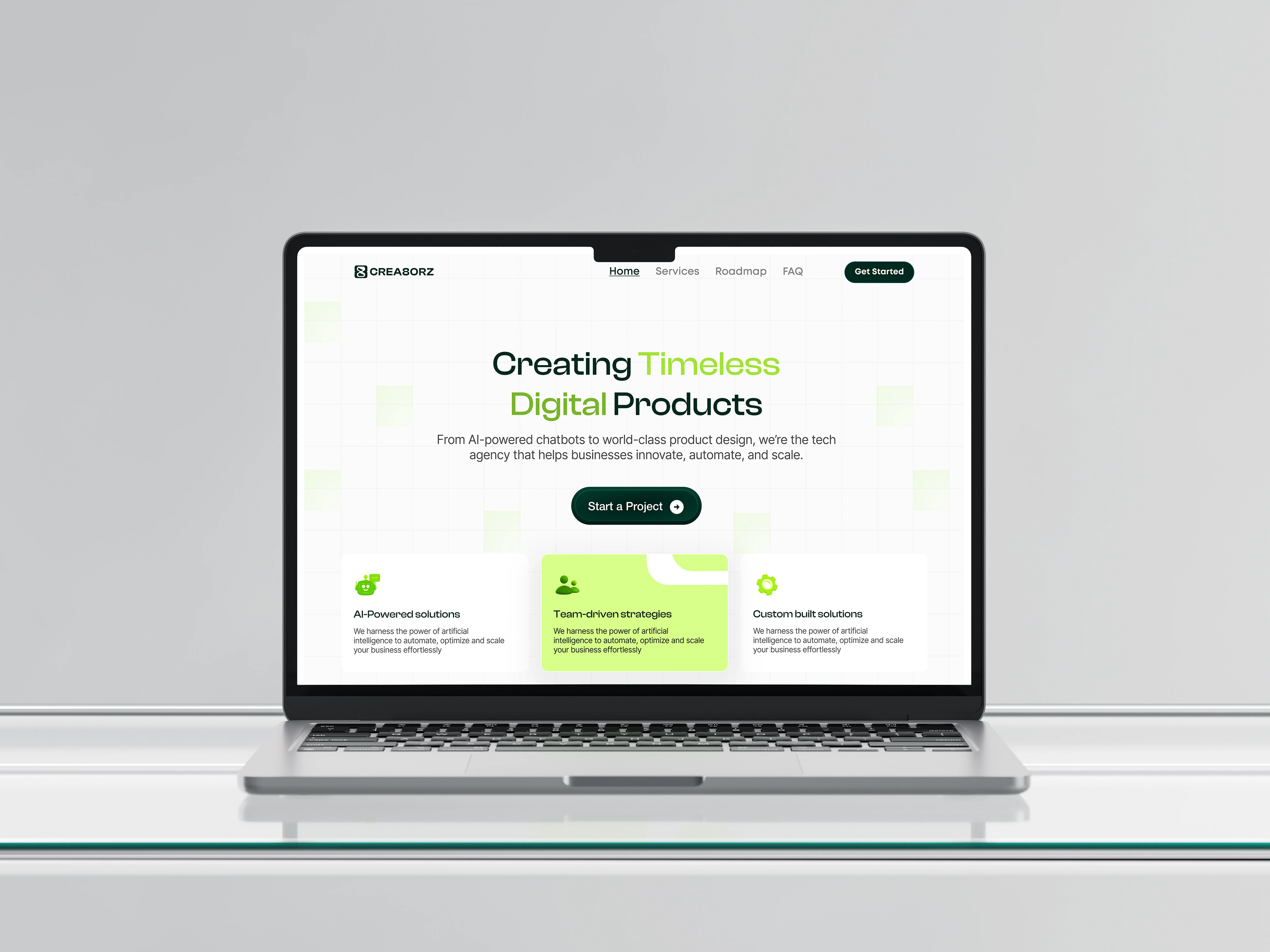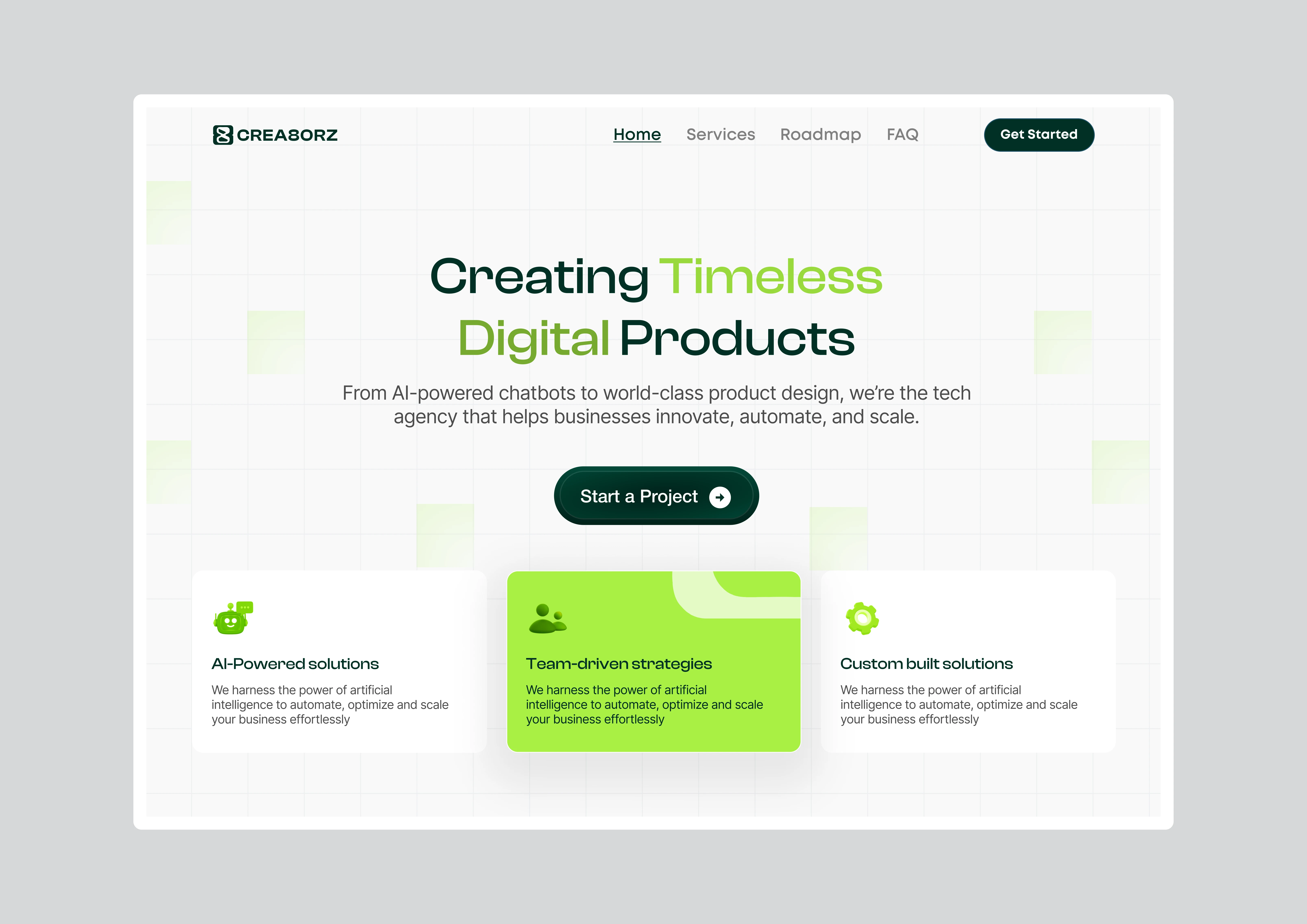 In the CREA8ORZ hero section, I prioritized a straightforward message and simplicity. The goal was to effectively guide users through the Agency's key value proposition, enhancing clarity and impact to ultimately boost conversions.