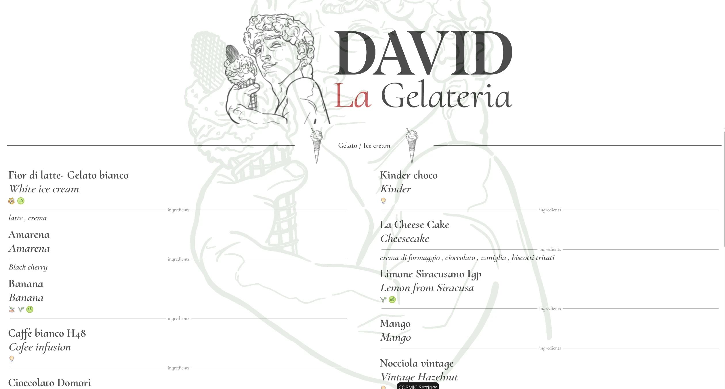 David La Gelateria is a complete management system developed for an artisanal gelato shop located in Florence, Italy. The system enables the shop owners to manage their product catalog, digital menu displays for in-store monitors, video advertisements (spots), and a customer-facing digital menu with bilingual support. The platform streamlines daily operations and provides an engaging visual experience for customers.