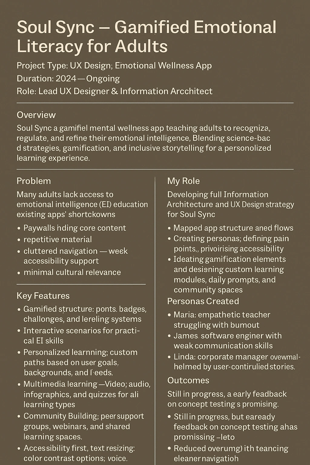 Designing for emotional intelligence means embracing nuance. I learned that people don’t want to be “fixed”—they want tools that meet them where they are, speak their language, and grow with them. Building Soul Sync challenged me to blend logic with empathy, and that balance has reshaped how I approach every UX project since.