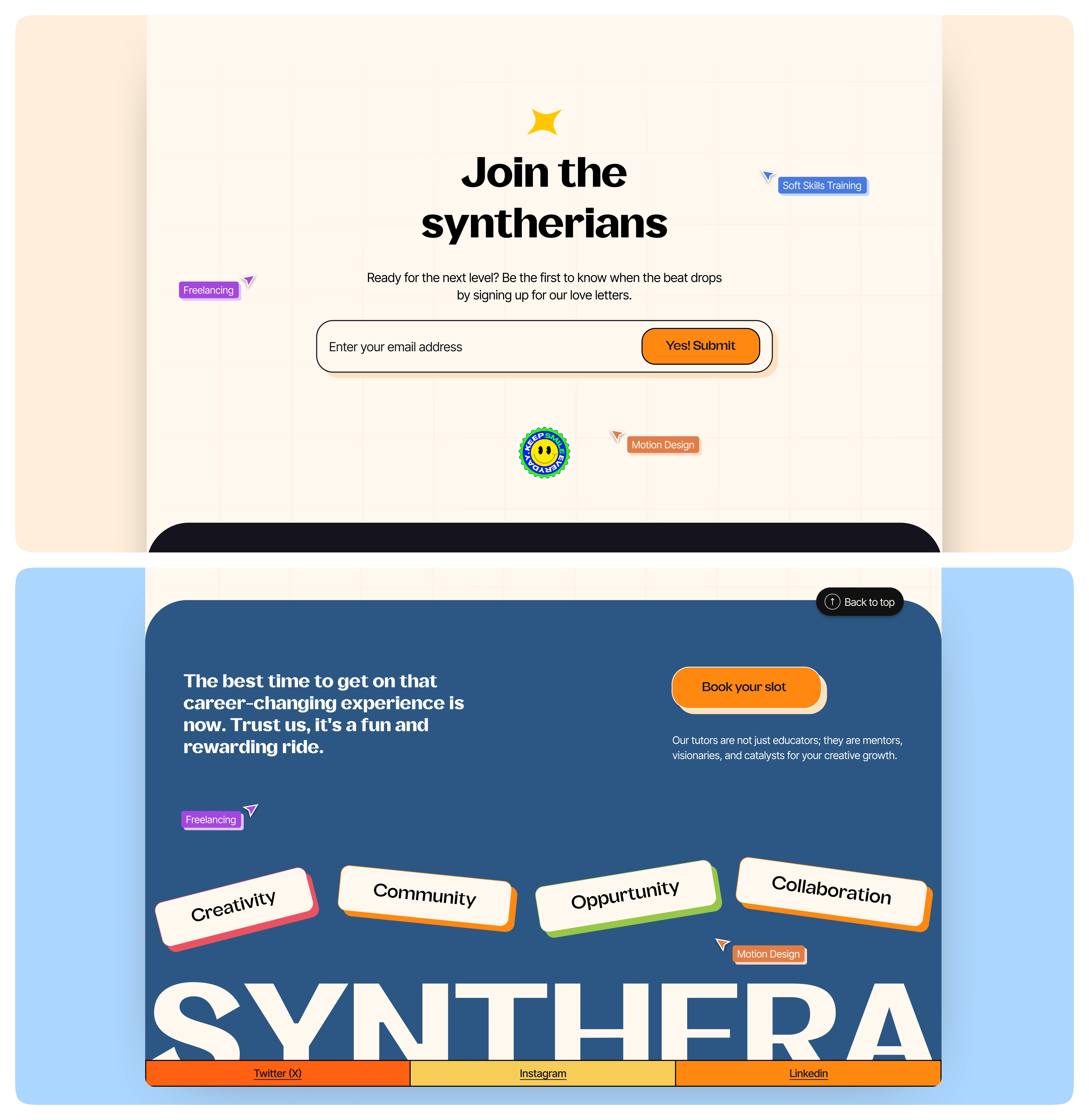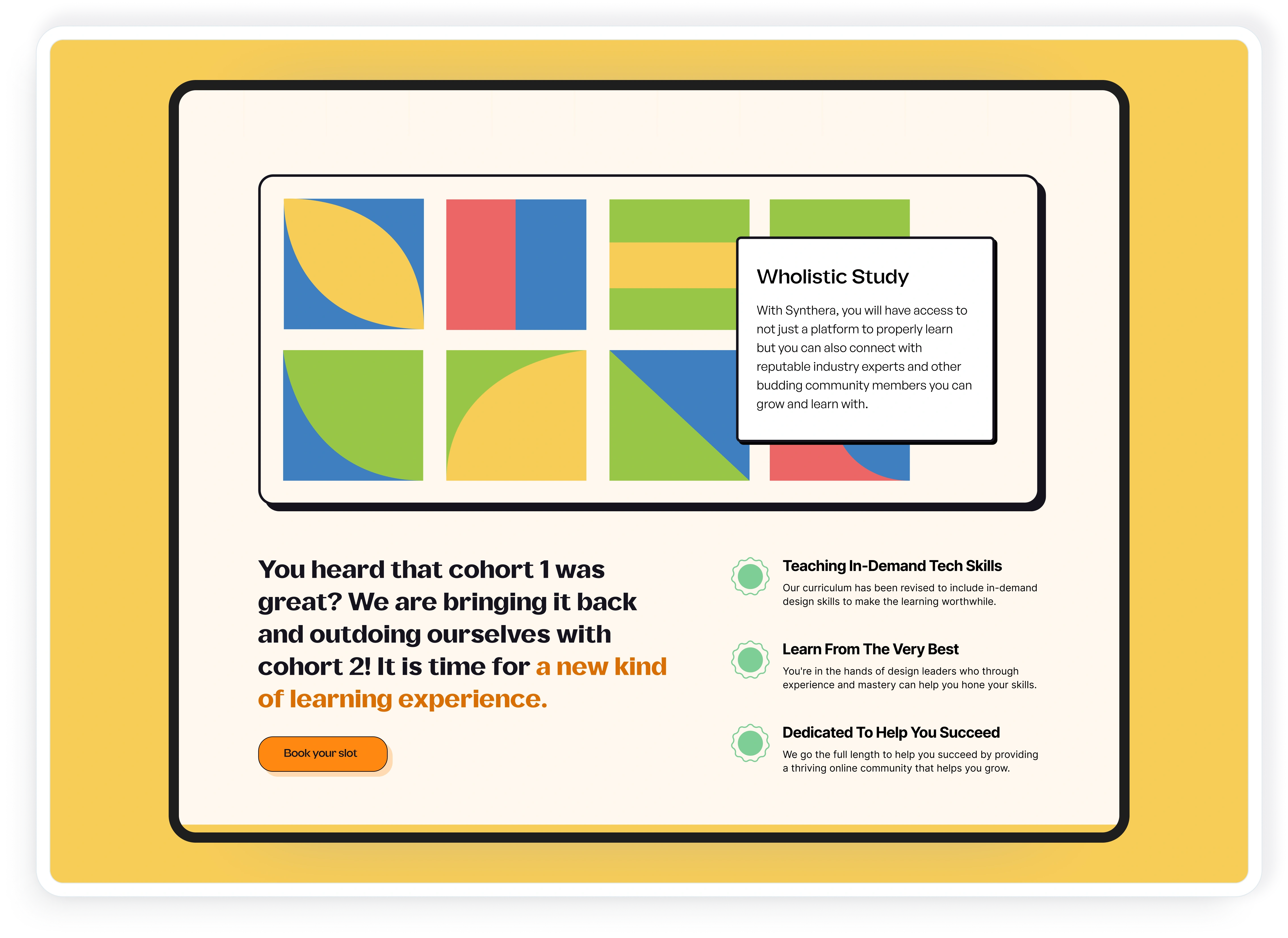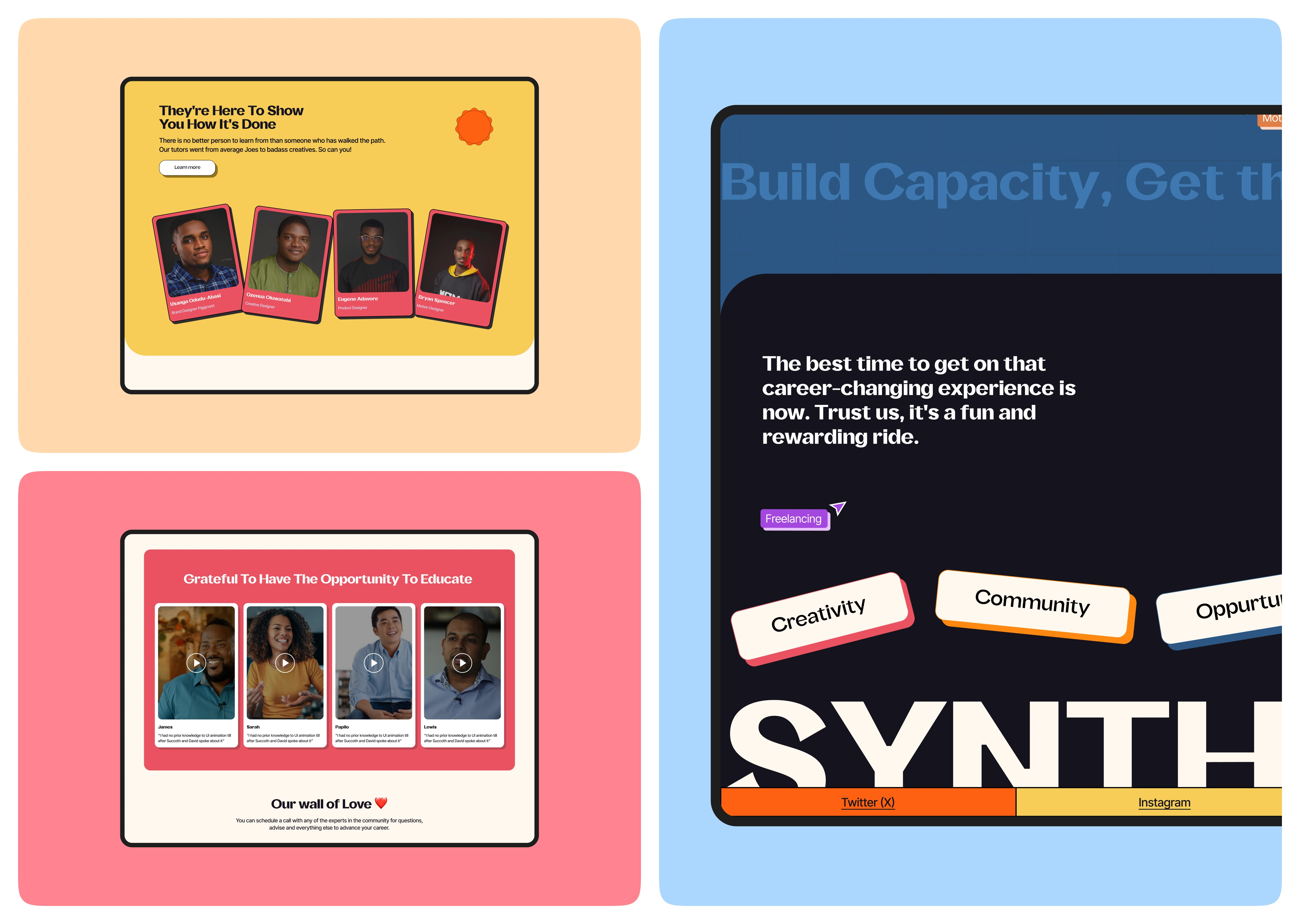 Every section of the site was designed to tell a story. From the hero banner, visitors were immediately introduced to Synthera’s mission: a new kind of learning community. Scrolling down, the narrative unfolded: the programs, the live classes, the mentors, and the benefits. Instead of just listing features, the design took users on a journey, making sure they understood not just what Synthera is, and why it matters.