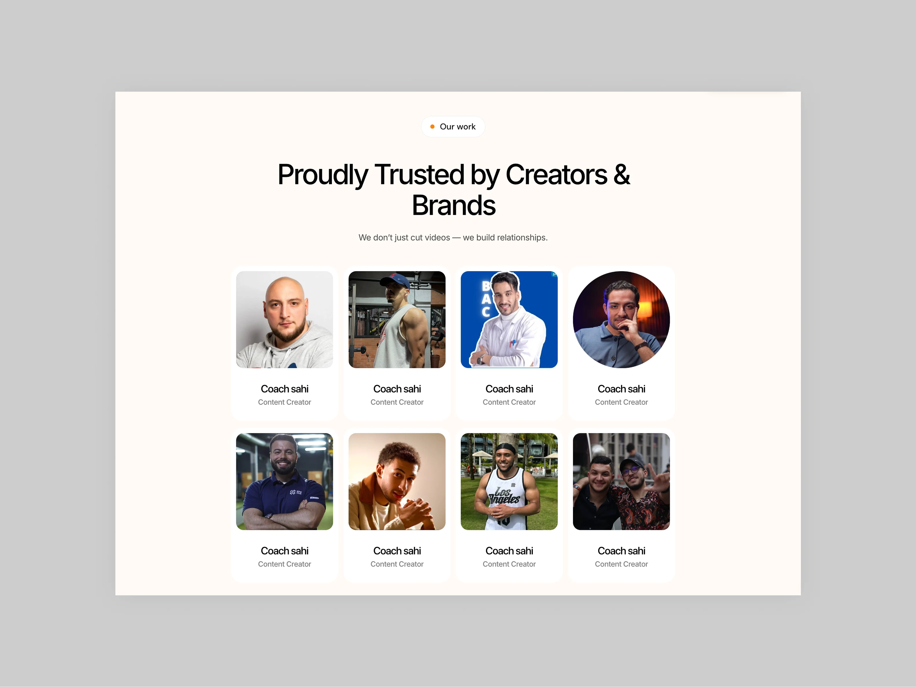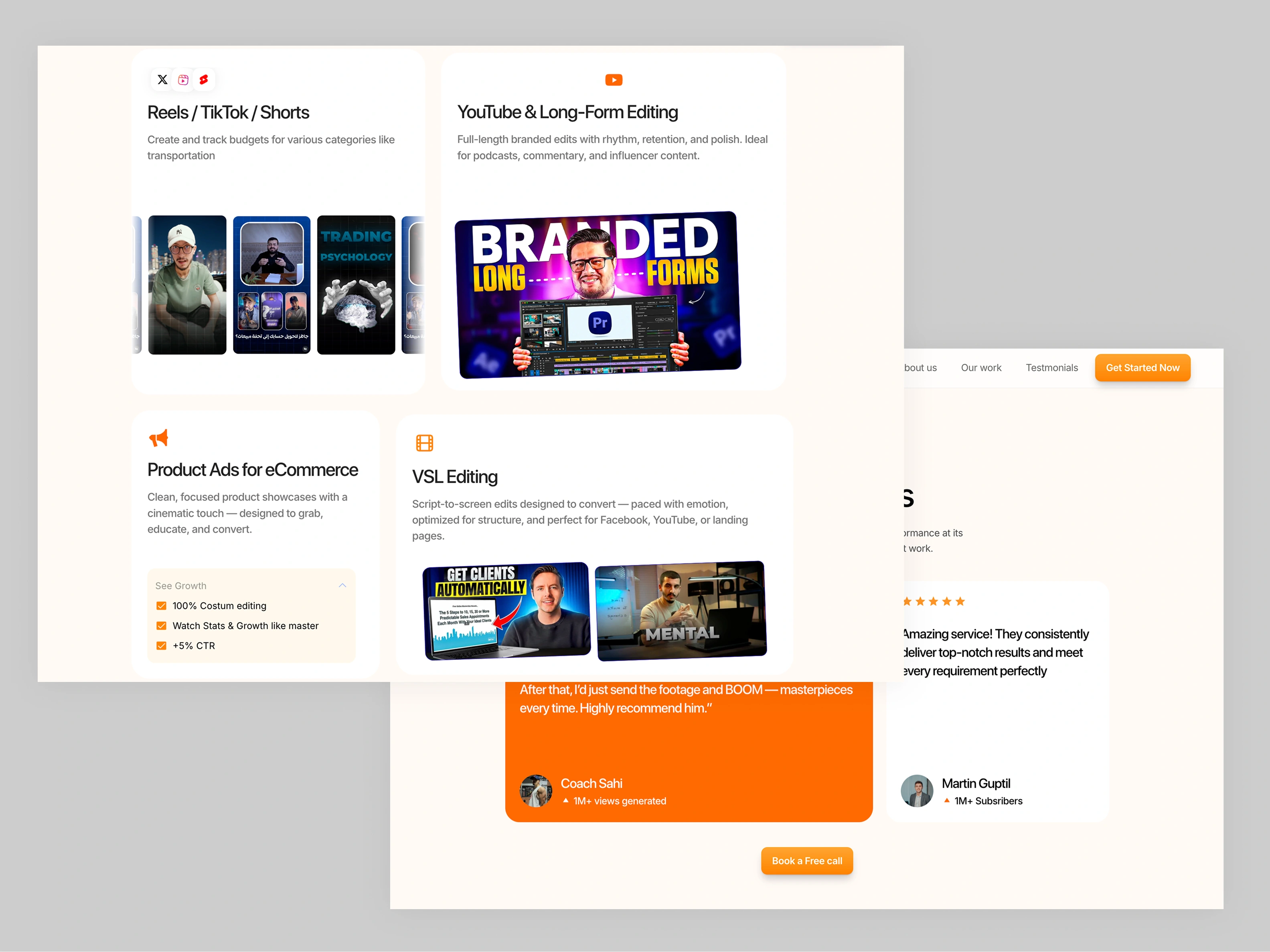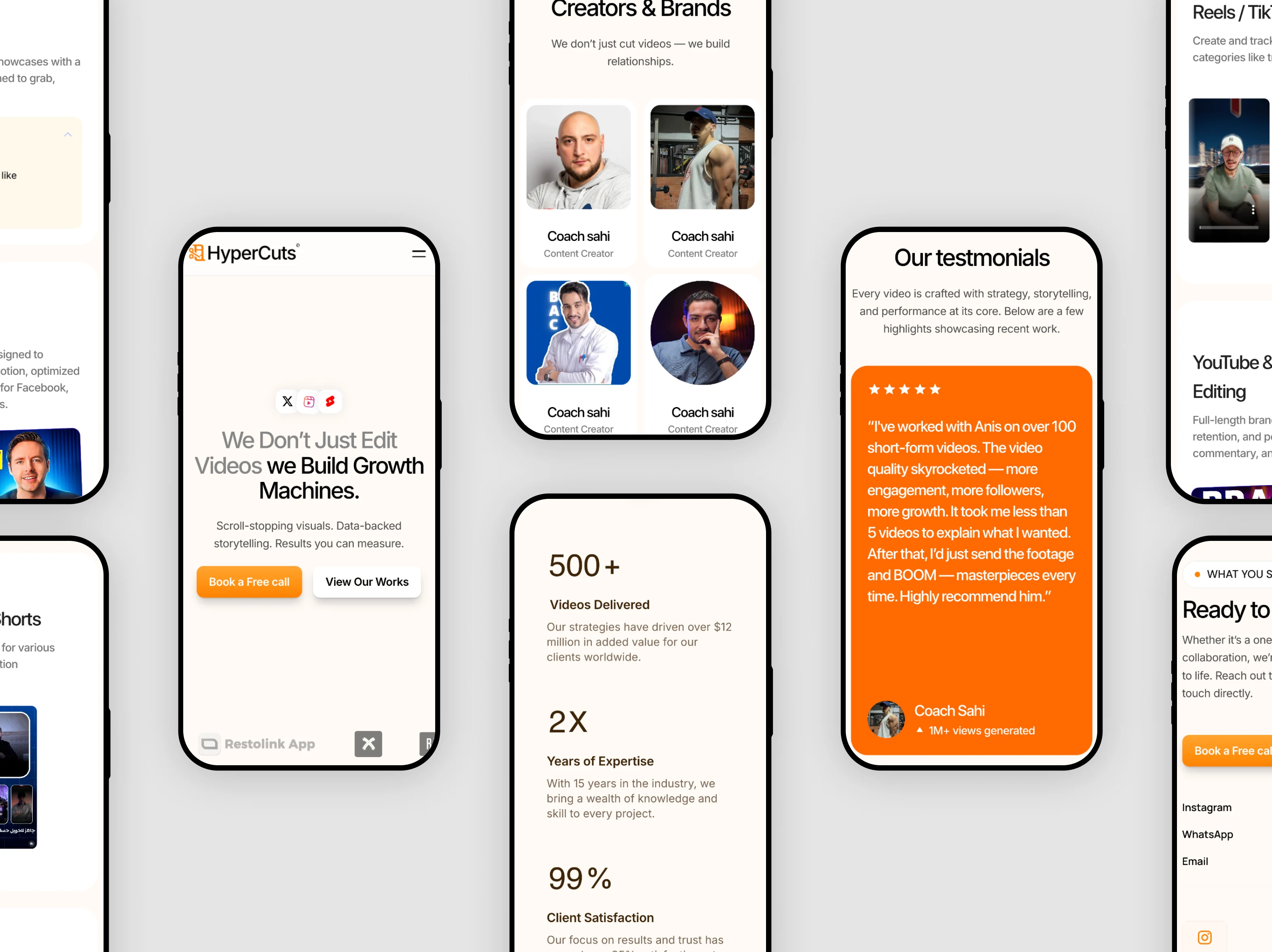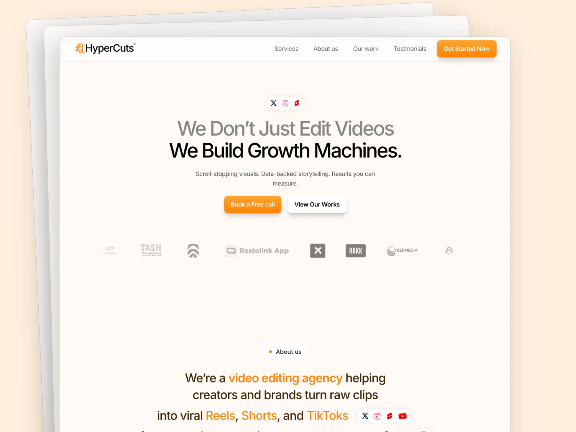 Created a landing page in framer for Hypercuts, a video editing agency helping creators and brands turn raw clips into viral Reels, Shorts, and TikToks.