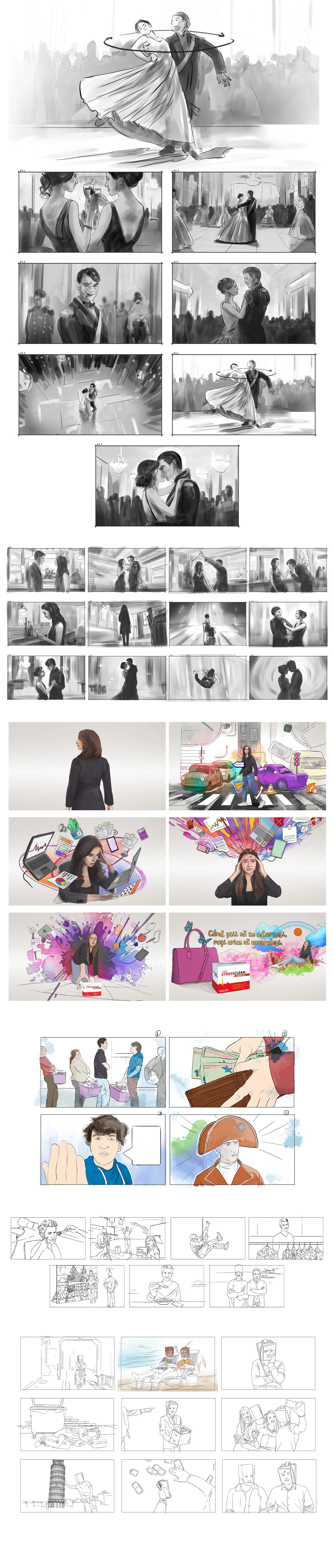 Storyboards for an Australian feature film. Advertising movie storyboards for a Romanian pharmaceutical company. Storyboards for two commercials about payment s