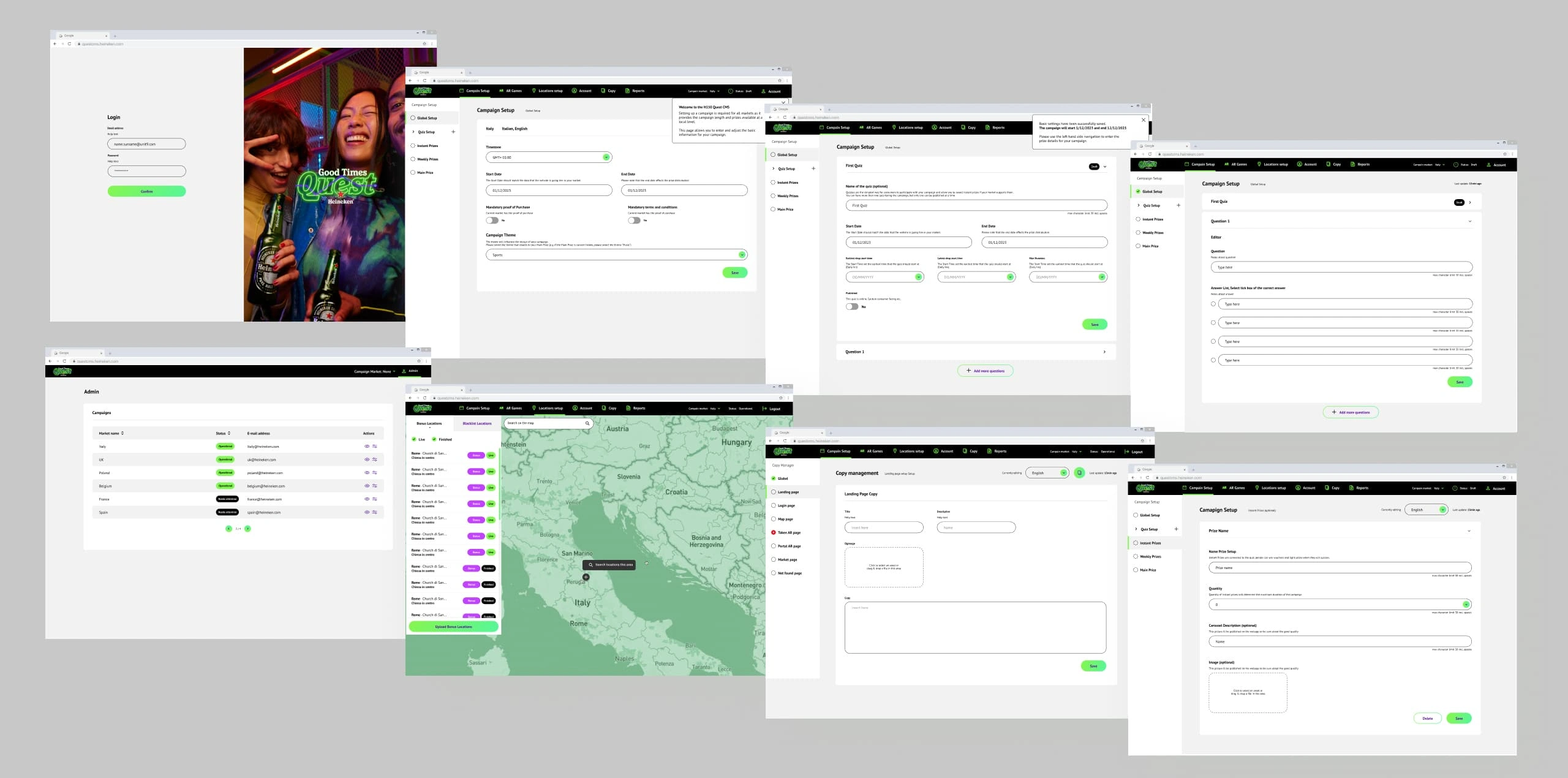 Heinequest is an AR treasure hunt game with instant prizes and virtual tokens scattered throughout physical locations. The game encourages users to go out, have fun, create teams and have a beer afterwards with friends. It has a custom content management system that allows managers to set up bonus locations, prizes, copyright.