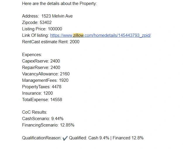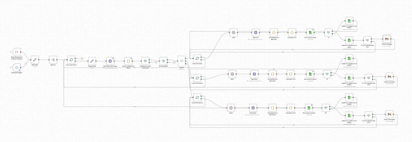 A daily n8n workflow that runs at 6am, scrapes current Zillow listings across three Wisconsin markets using Apify, applies a three-stage filter, pulls rent estimates from RentCast, calculates dual-scenario ROI, deduplicates against Google Sheets history, and delivers a formatted Gmail alert for any property hitting the 12% cash-on-cash threshold.