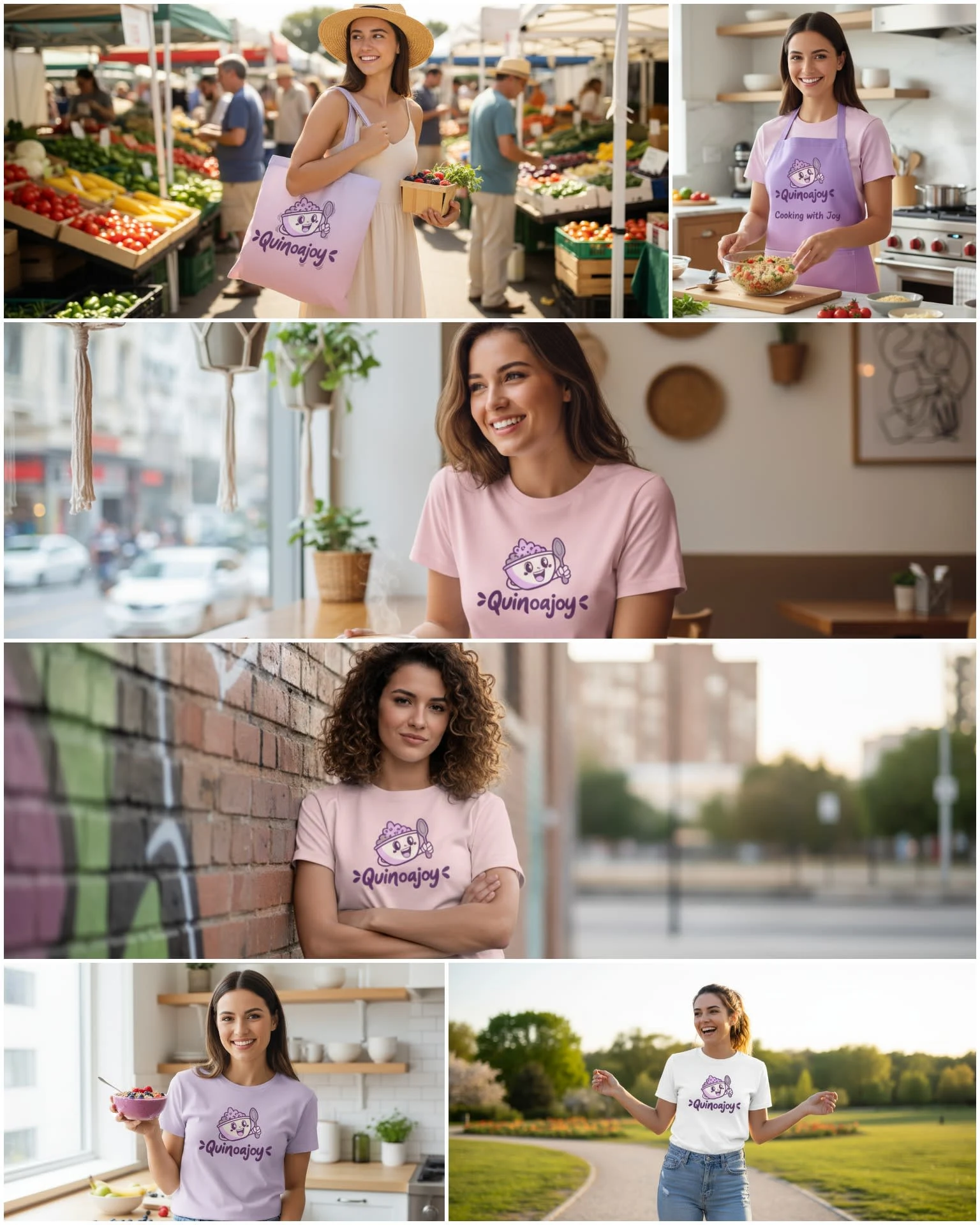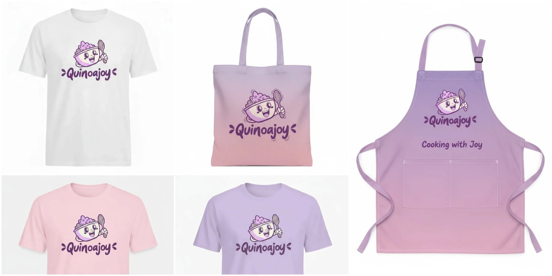 Developed merchandise (T-shirts, tote bags, aprons) via: "Generate T-shirts with the logo and playful Quinoajoy logo tote bags for eco-friendly branding, and aprons for a pop-up event."