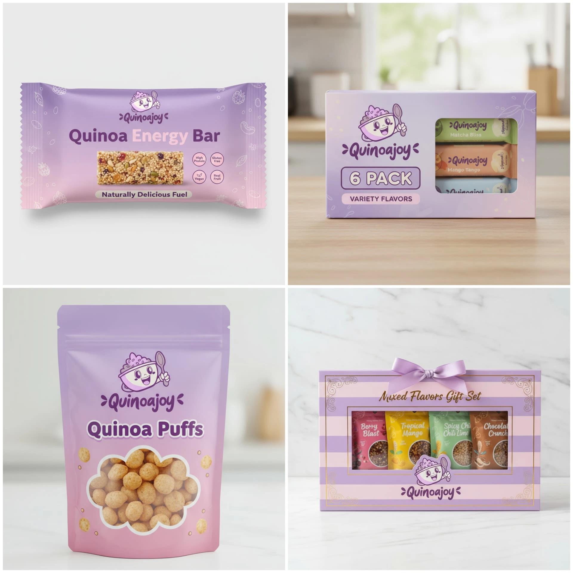 Refined the logo with smart suggestions (e.g., transparent background) and expanded to packaging designs (snack bar wrappers, pouches, gift sets) with: "Use this transparent logo and design snack bar wrappers, pouches for quinoa puffs, and gift box sets with mixed flavors."