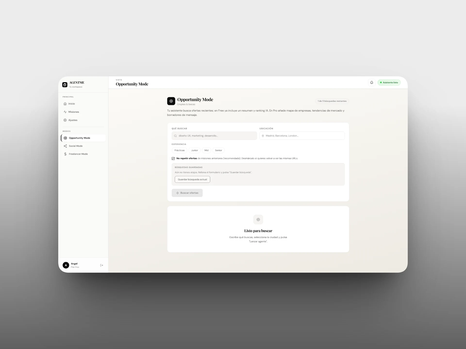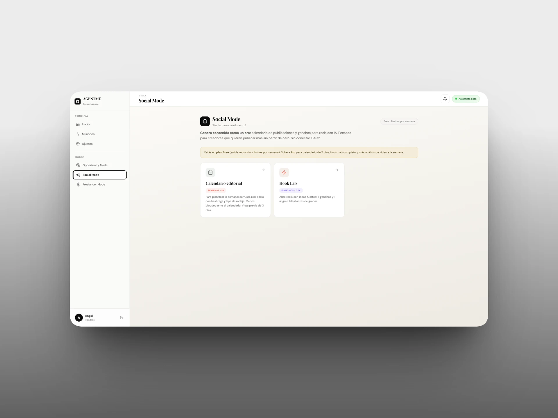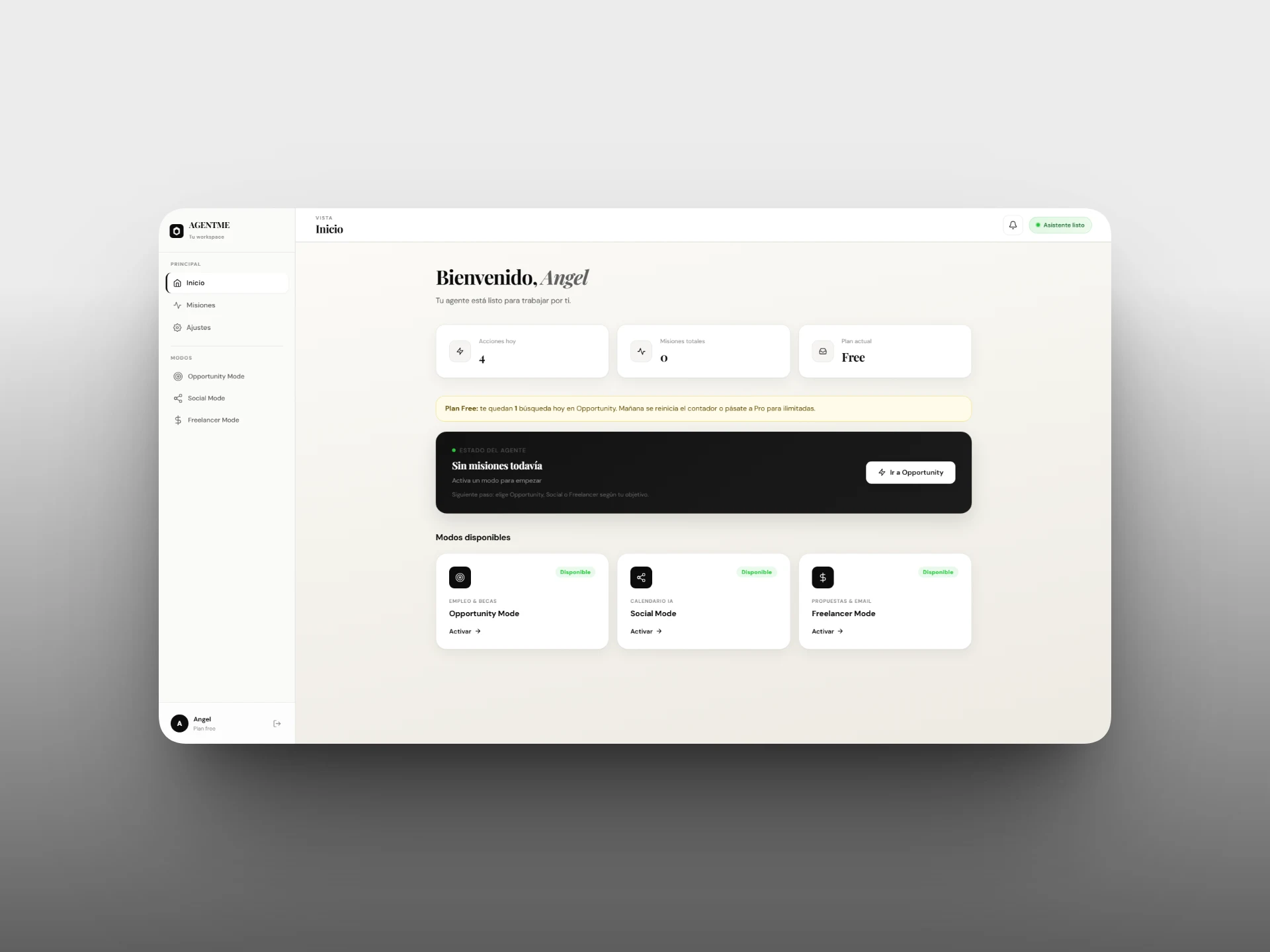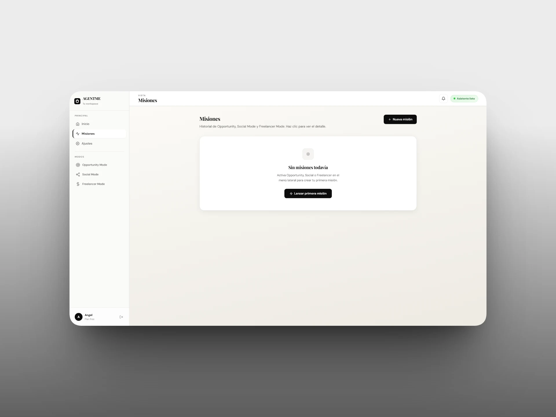 AGENTME is a full-stack web app where users describe goals in natural language and the platform turns them into missions powered by AI and persistent data — covering job opportunity search and analysis, social content (editorial calendar and hook lab), and freelance-oriented flows (leads, proposals).