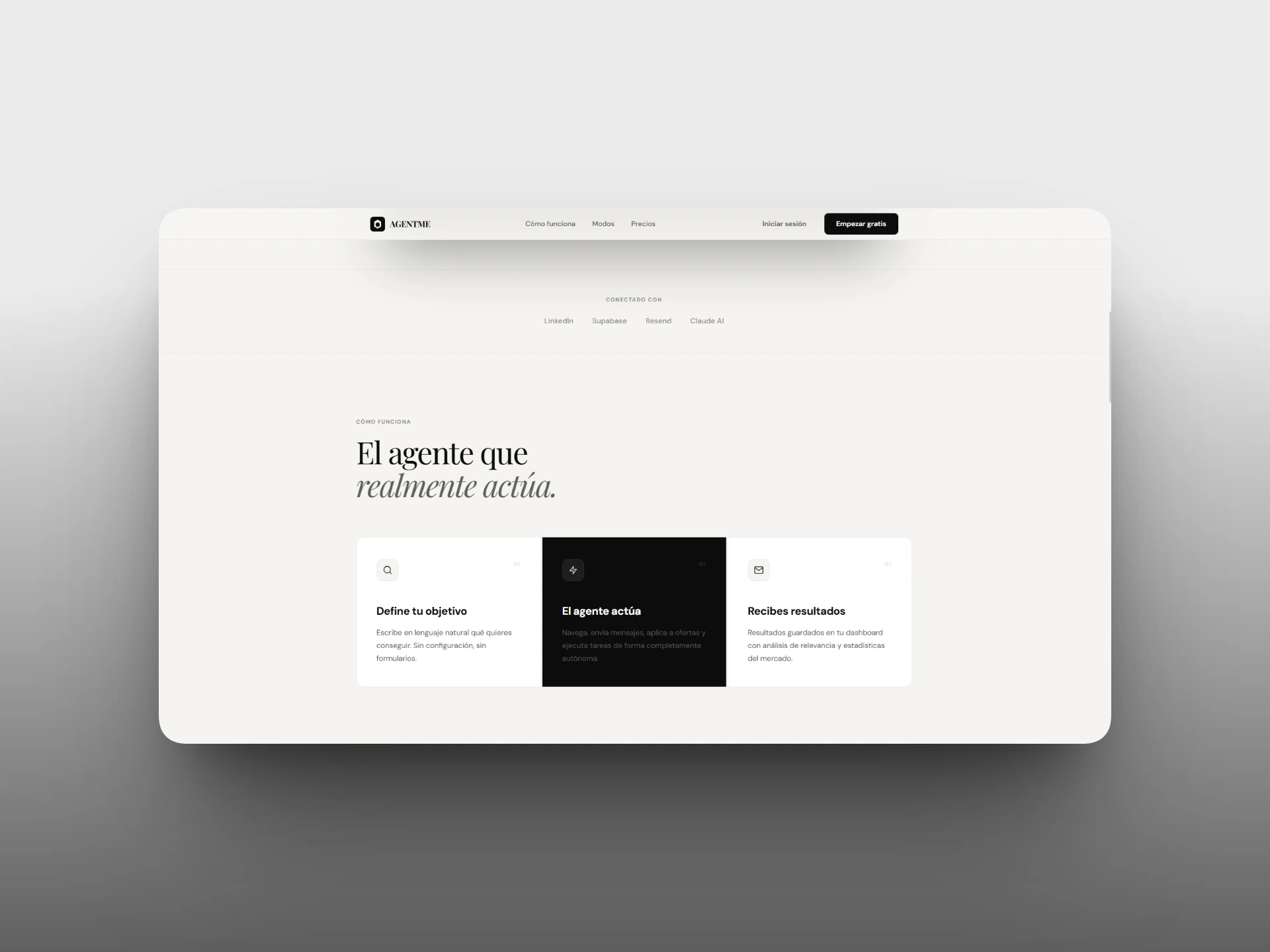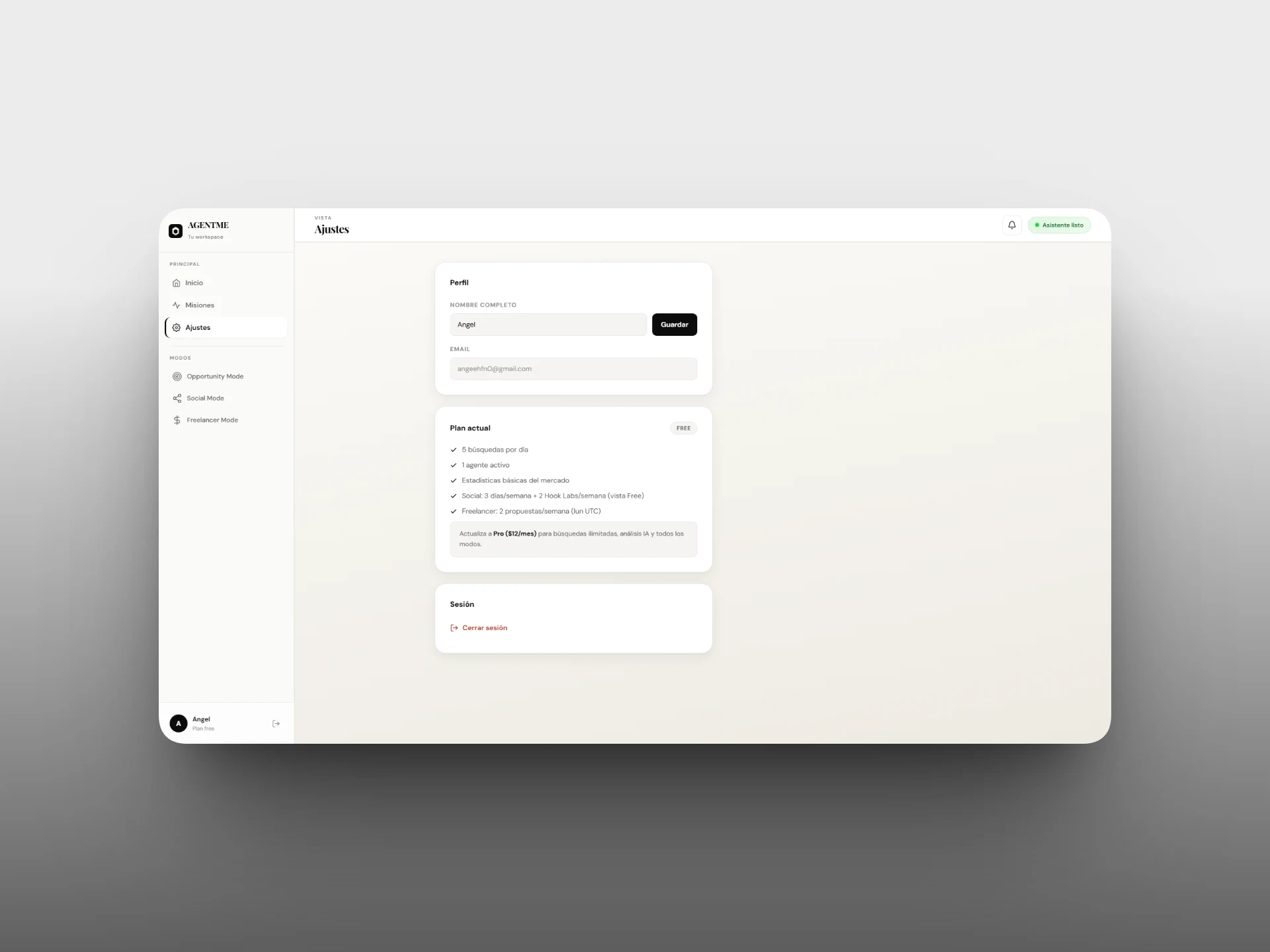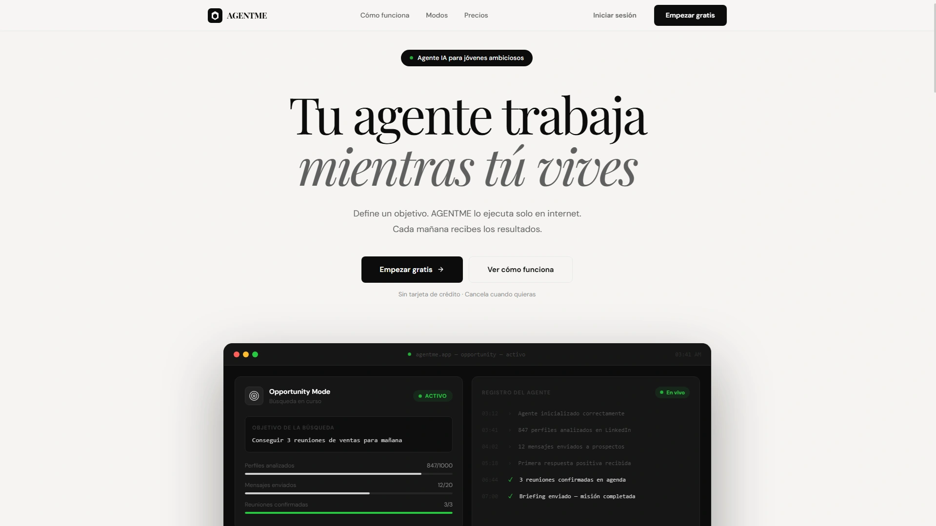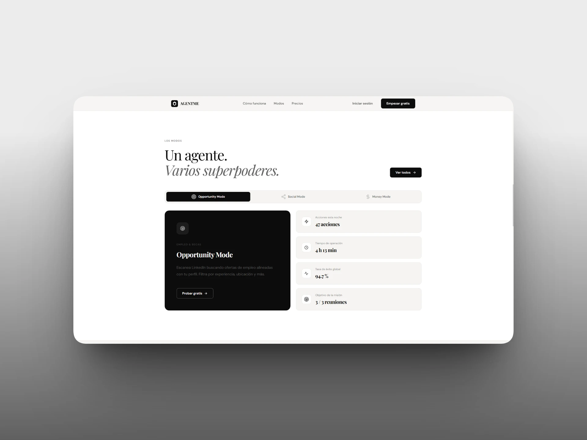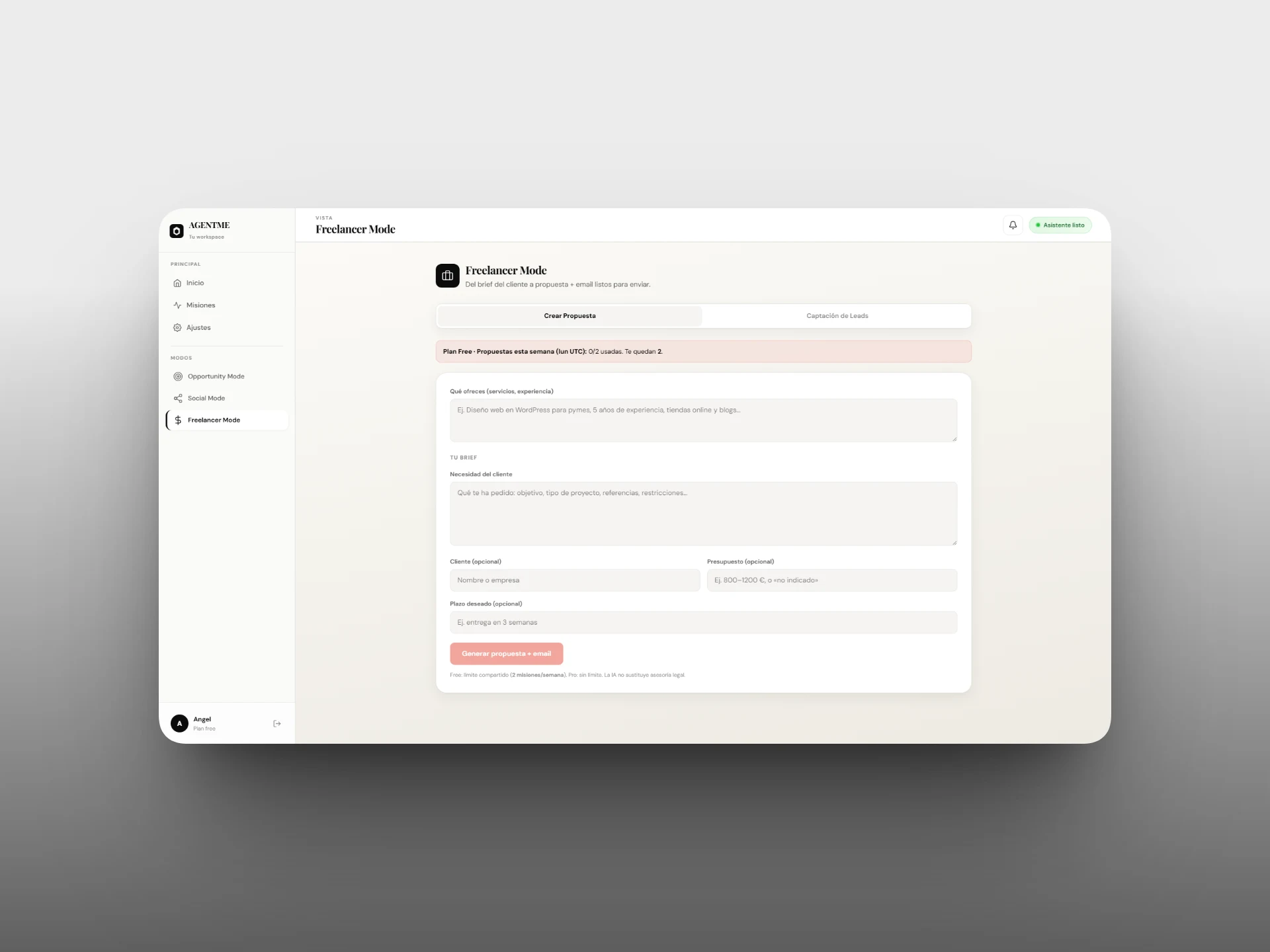 AGENTME is a full-stack web app where users describe goals in natural language and the platform turns them into missions powered by AI and persistent data — covering job opportunity search and analysis, social content (editorial calendar and hook lab), and freelance-oriented flows (leads, proposals).