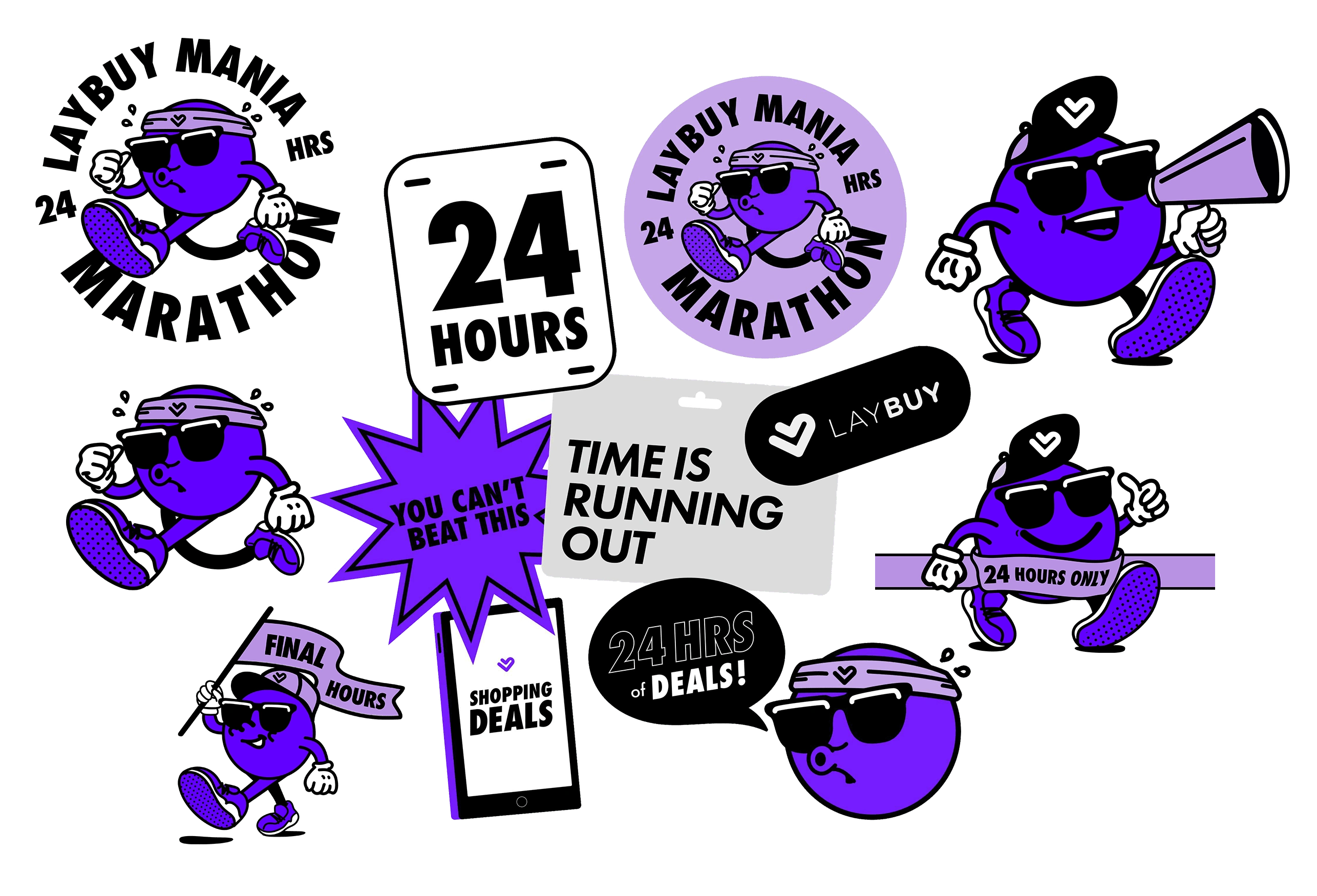 Working with an illustration team, we came up with multiple concepts for "Larry Laybuy" who would be the forefront of the creative direction of Laybuy Mania. The direction was to focus on stickers, and running animations. The limited colours made it perfect for GIF and vector based animations.