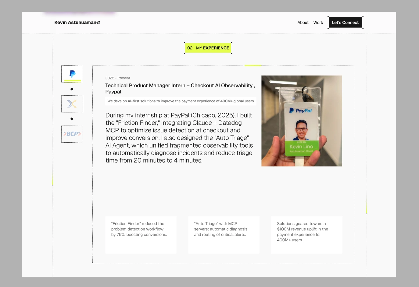 Top-Tier AI/Fintech Expertise: Dedicate the "Work" section to highlight the PayPal PM Internship experience, specifically in