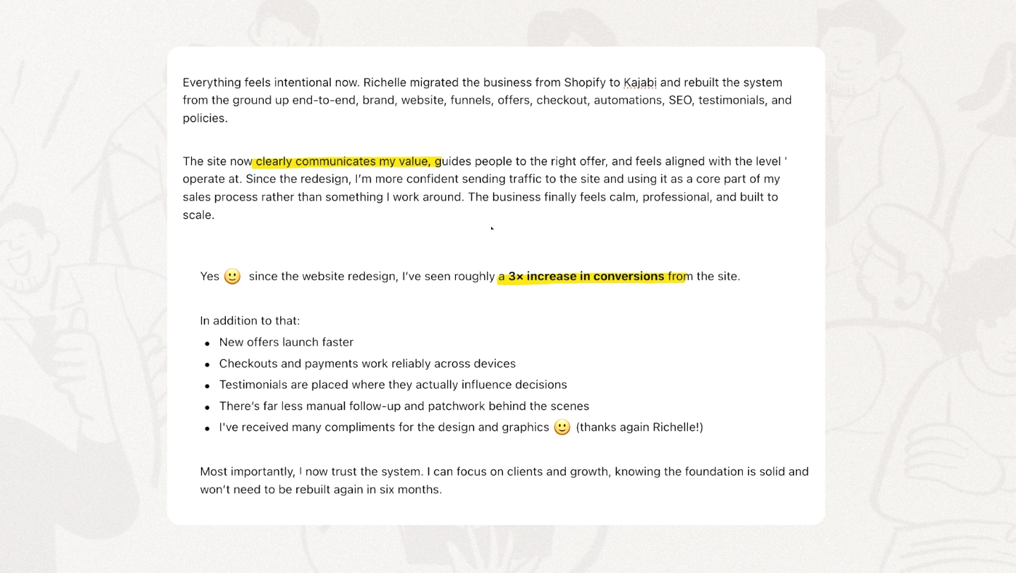 Everything now feels intentional. The business was migrated to Kajabi and rebuilt from the ground up — including brand, website, funnels, offers, checkouts, automations, SEO, testimonials, and policies. The site clearly communicates value, guides visitors to the right offer, and reflects the level the business operates at. Confidence increased around sending traffic to the site and using it as a core sales asset instead of something to work around. The business now feels calm, professional, and built to scale.