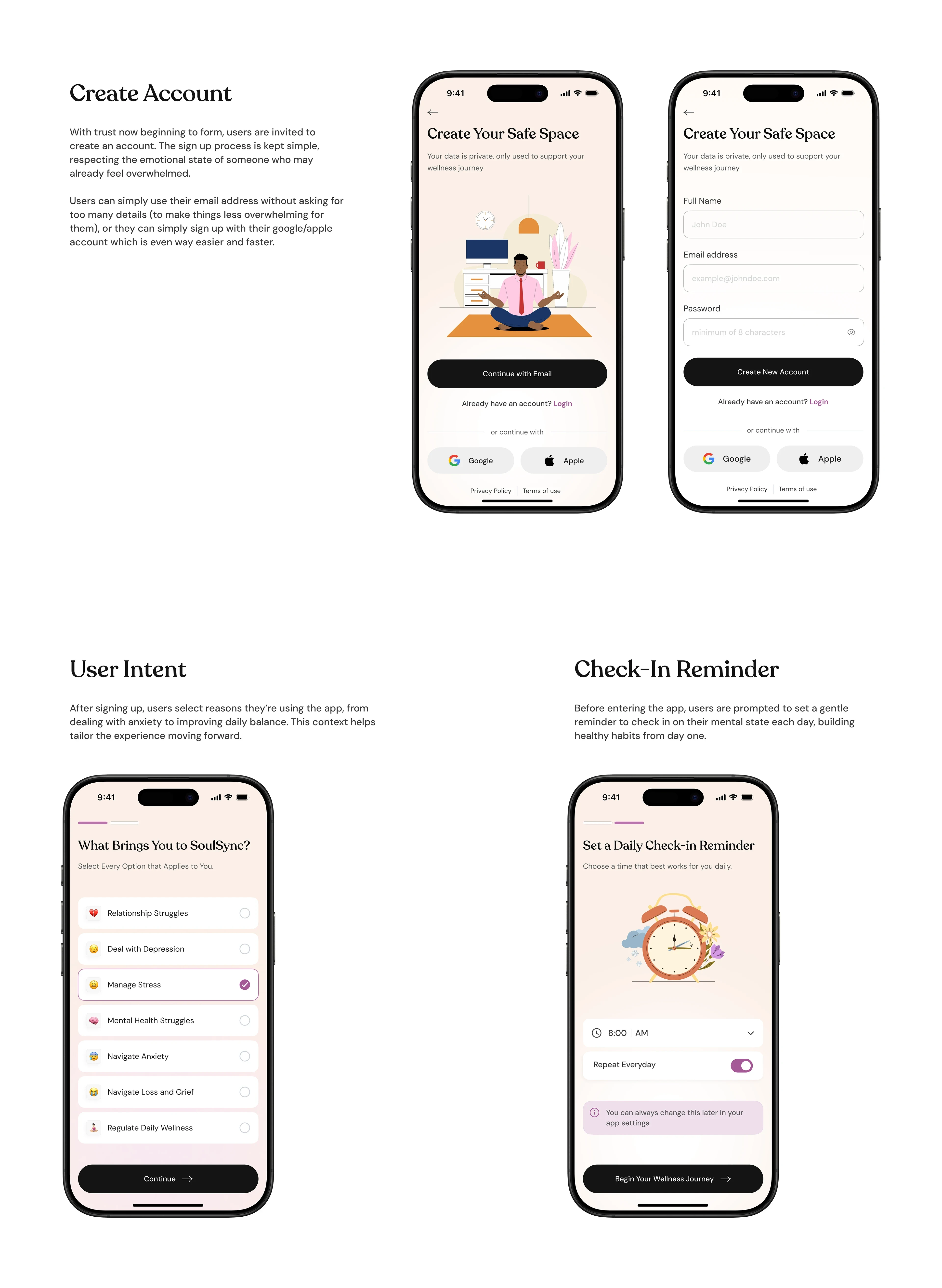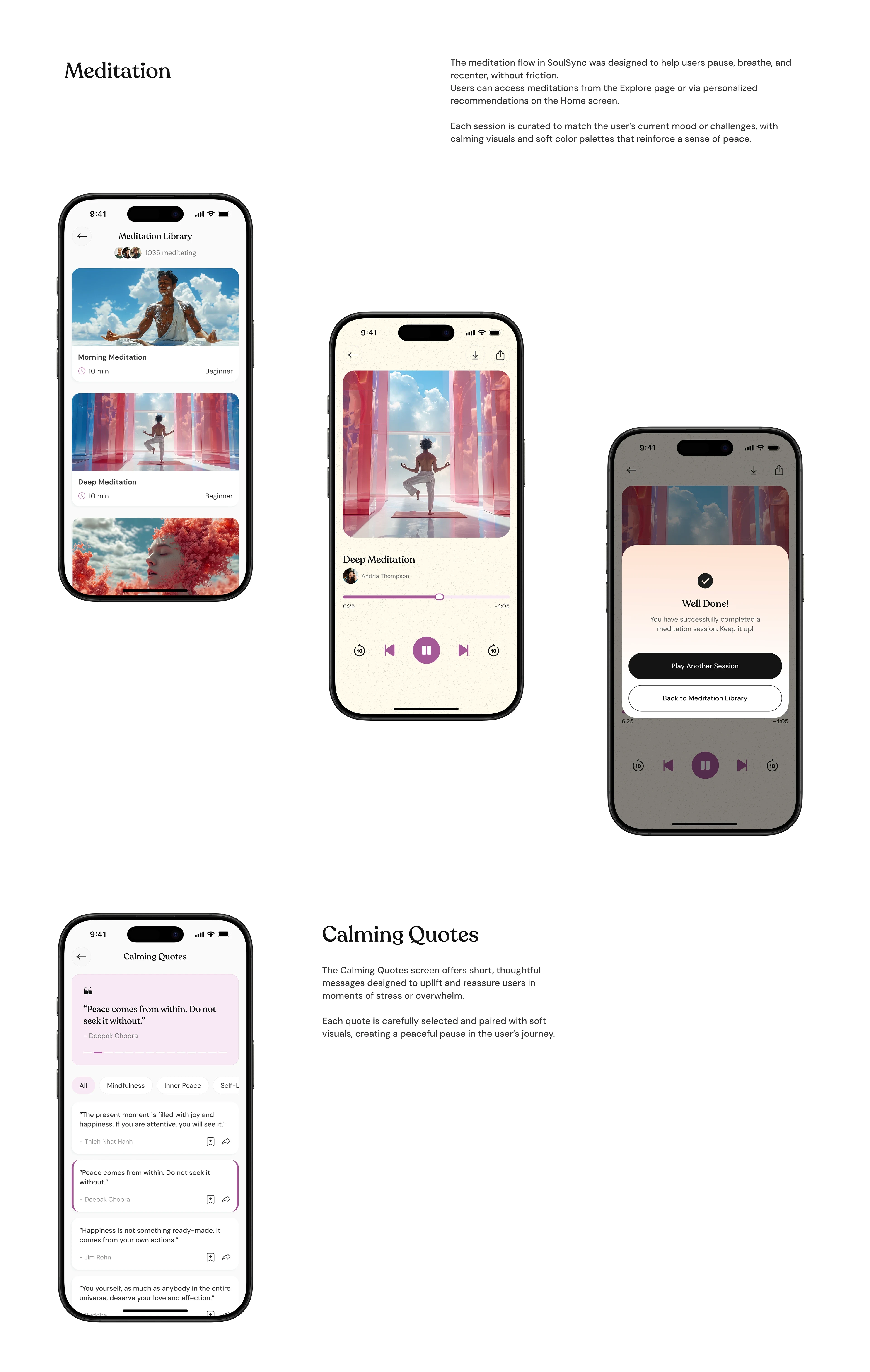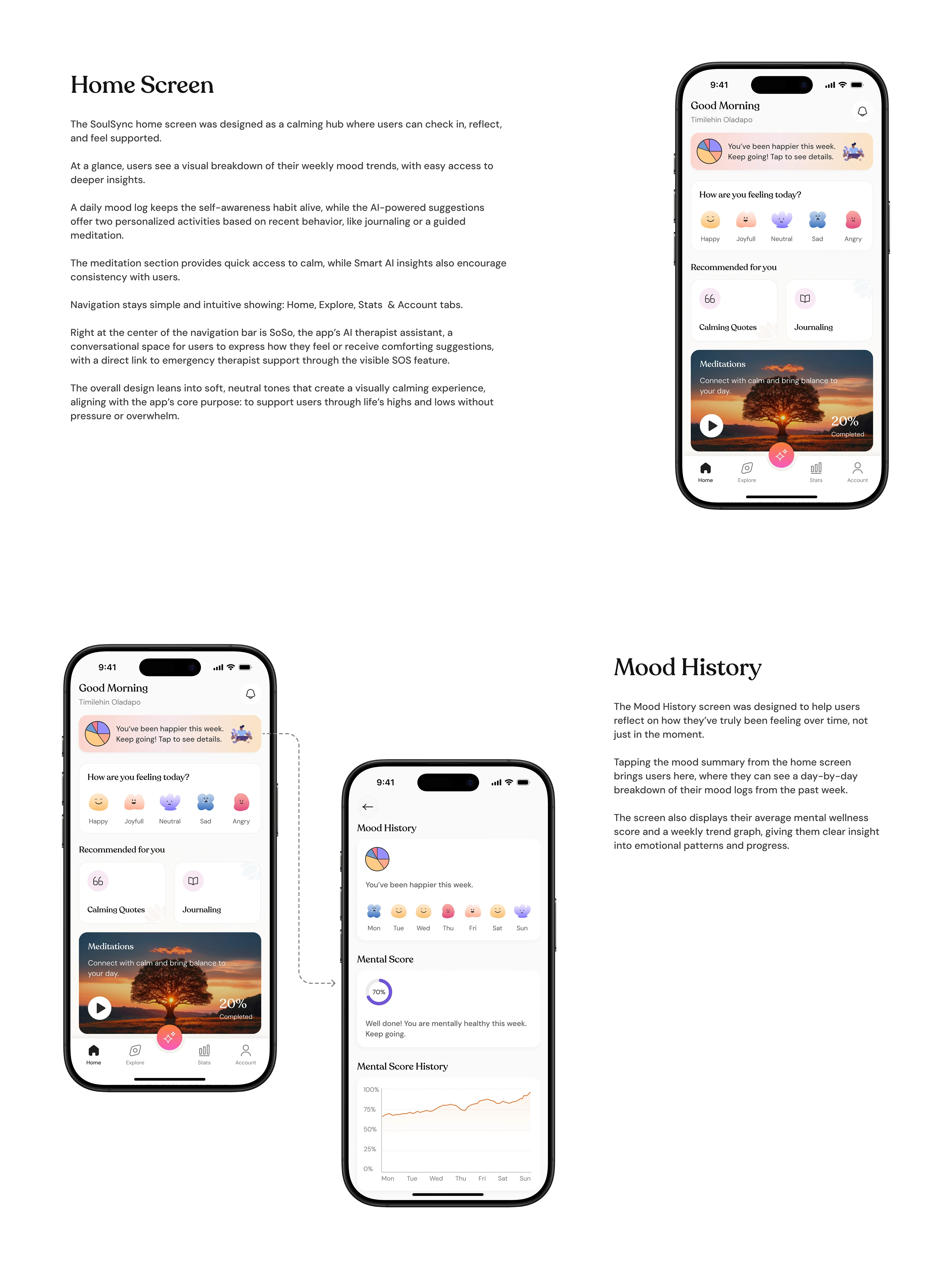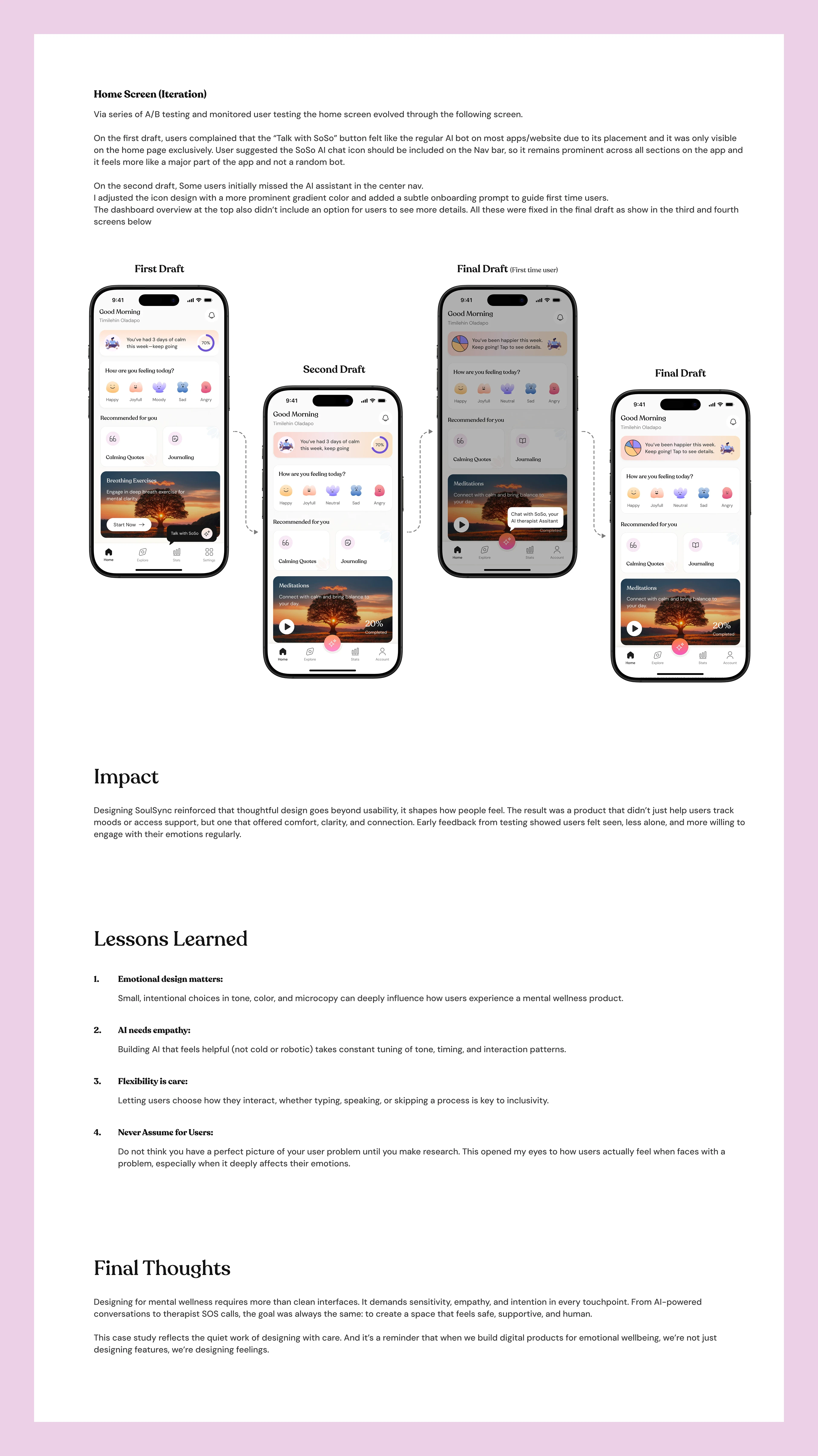 SoulSync is an app that brings a more human and emotionally aware approach to mental wellness. This case study shows my process from idea to execution.